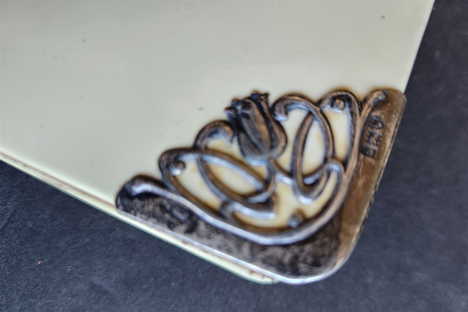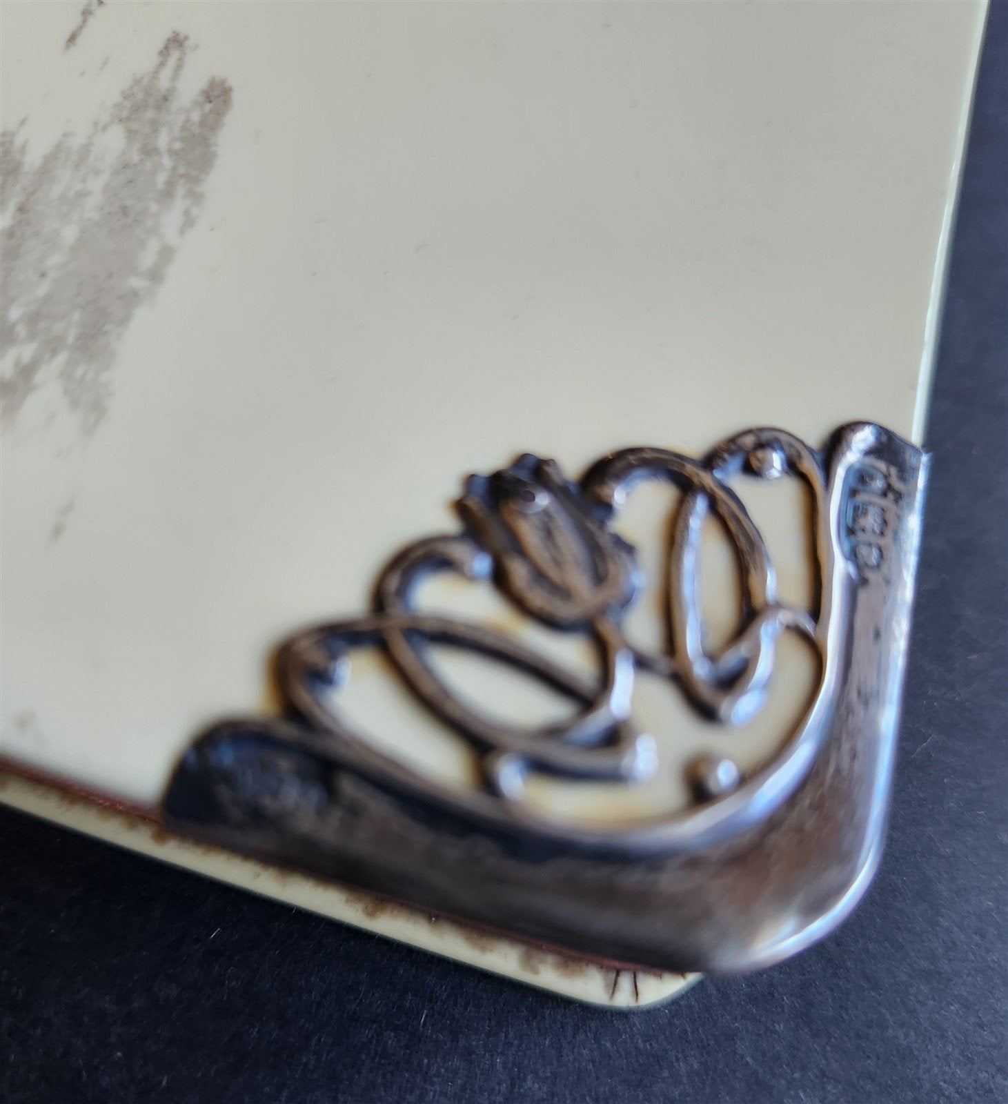 Front cover decorated with hallmarked silver corners.