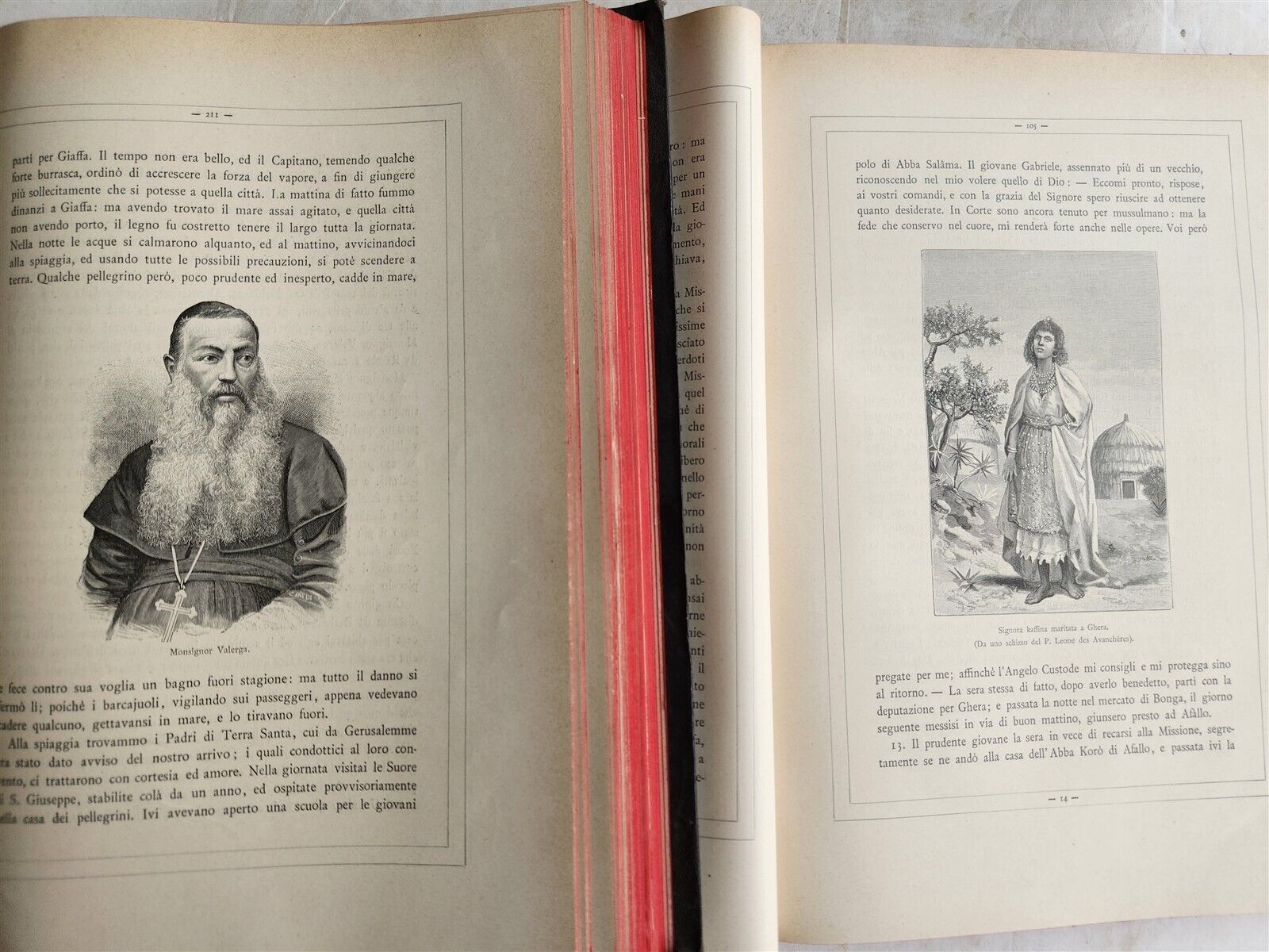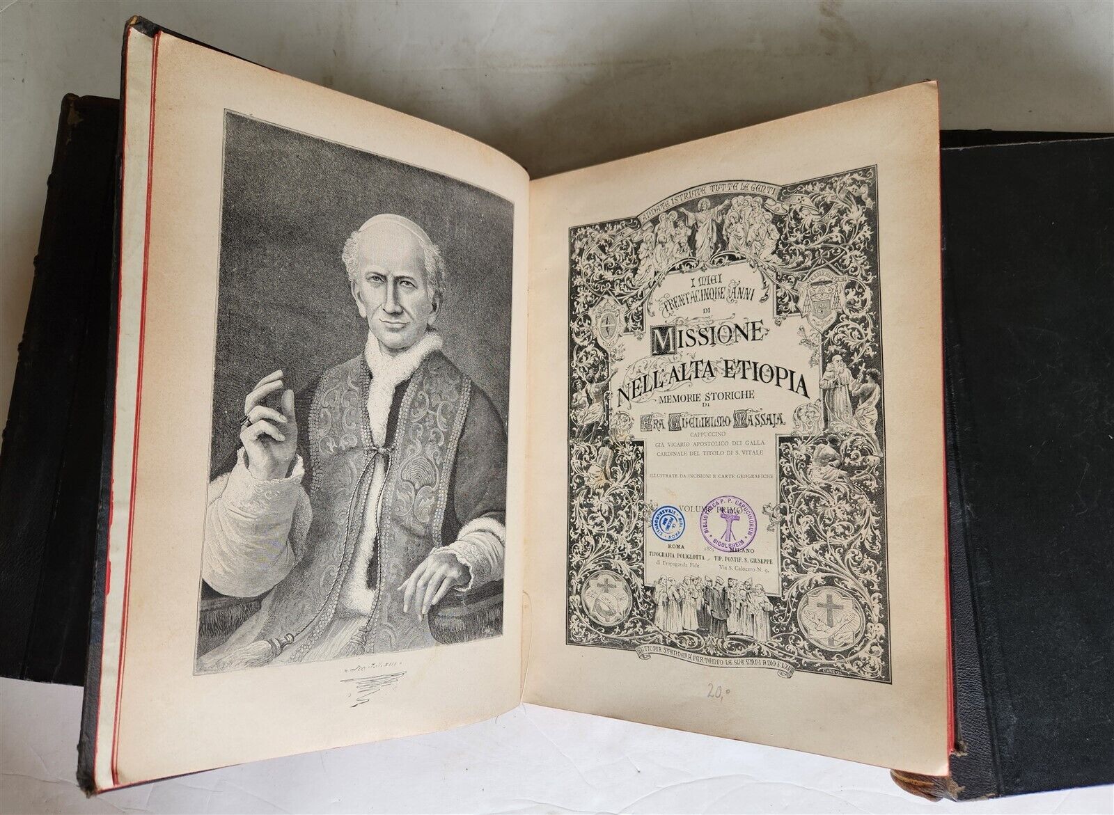 I miei trentacinque anni di missione nell alta Etiopia. Memorie storiche. by Massaja, G.(My thirty-five years of missions in high Ethiopia. Historical memories) 12 parts in 6 volumes. Rome, Tipografia Poliglotta, Milan, Tip. Pont. S. Giuseppe ; 1885-95 Folio: 10 by 13.5 inches with numerous woodcut illustrations and maps. 216 pages, with 37 illustrations; 219 pages, with 32 illustrations; 220 pages, with 25 illustrations; 254 pp., with 22 illustrations; 213 pp., with 23 illustrations and 2 color maps; 200 pp., with 20 illustrations; 227 pp., with 24 illustrations; 222 pp., with 25 illustrations; 215 pp., with 29 illustrations; 214 pp., with 26 illustrations; 198 pp., with 24 illustrations; 287 pp., with 28 woodcut illustrations.Original 3/4 cloth, spines with raised bands and titles in gilt.Red edges.Some wear of bindings, very good interior.Text in Italian====================================The Capuchin Massaja (1809-1889) was a missionary in Ethiopia between 1846 and 1884 (a true apostle of the Galla people);in 1884 he was appointed cardinal. ================================Please see my other auctions Thank You