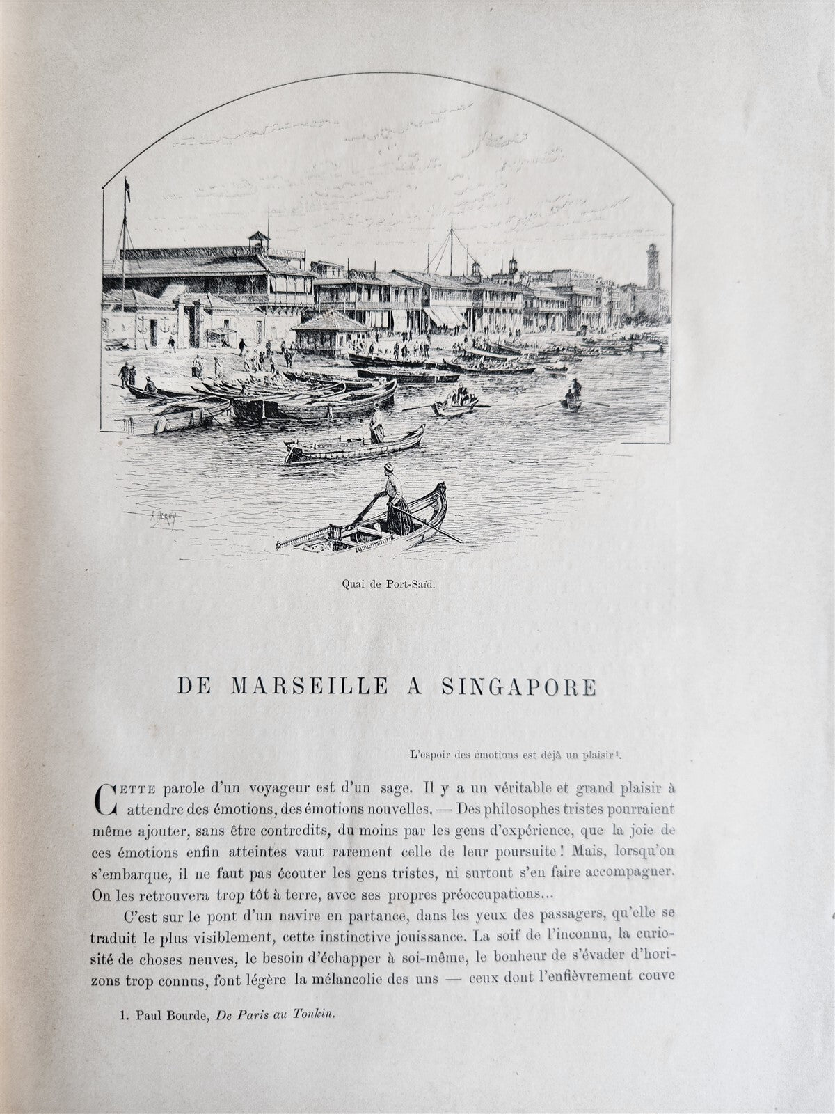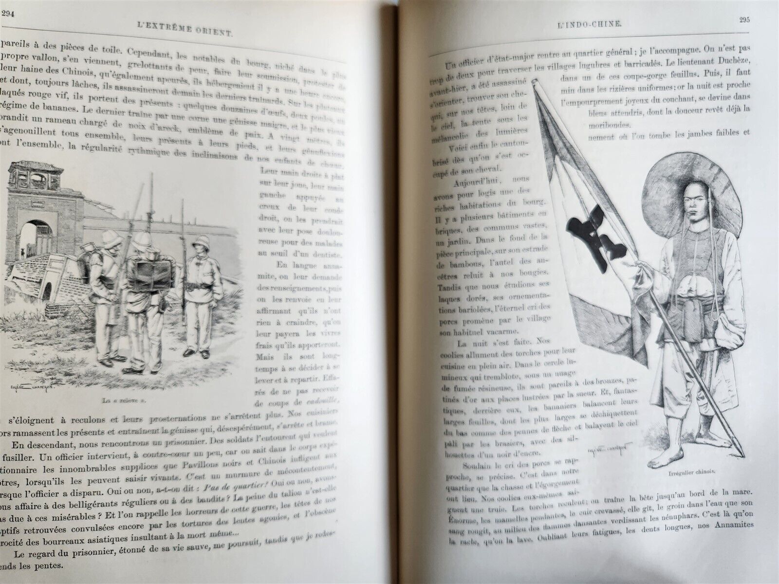 L'Extreme Orient. Ouvrage Illustre de nombreux dessins d'après nature et accompagné de three cartes dressées d'après les documents les plus recents. Le Monde Pittoresque et Monumental. by Paul BonnetainParis, Maison Quantin; 1887With 3 maps and numerous woodcut illustrations 613 pp.Original decorative cloth, gilt edgesSize 8 1/2 by 11 3/4 inchesWorn binding, very good interiorText in French=============================================Please see my other auctions Thank You