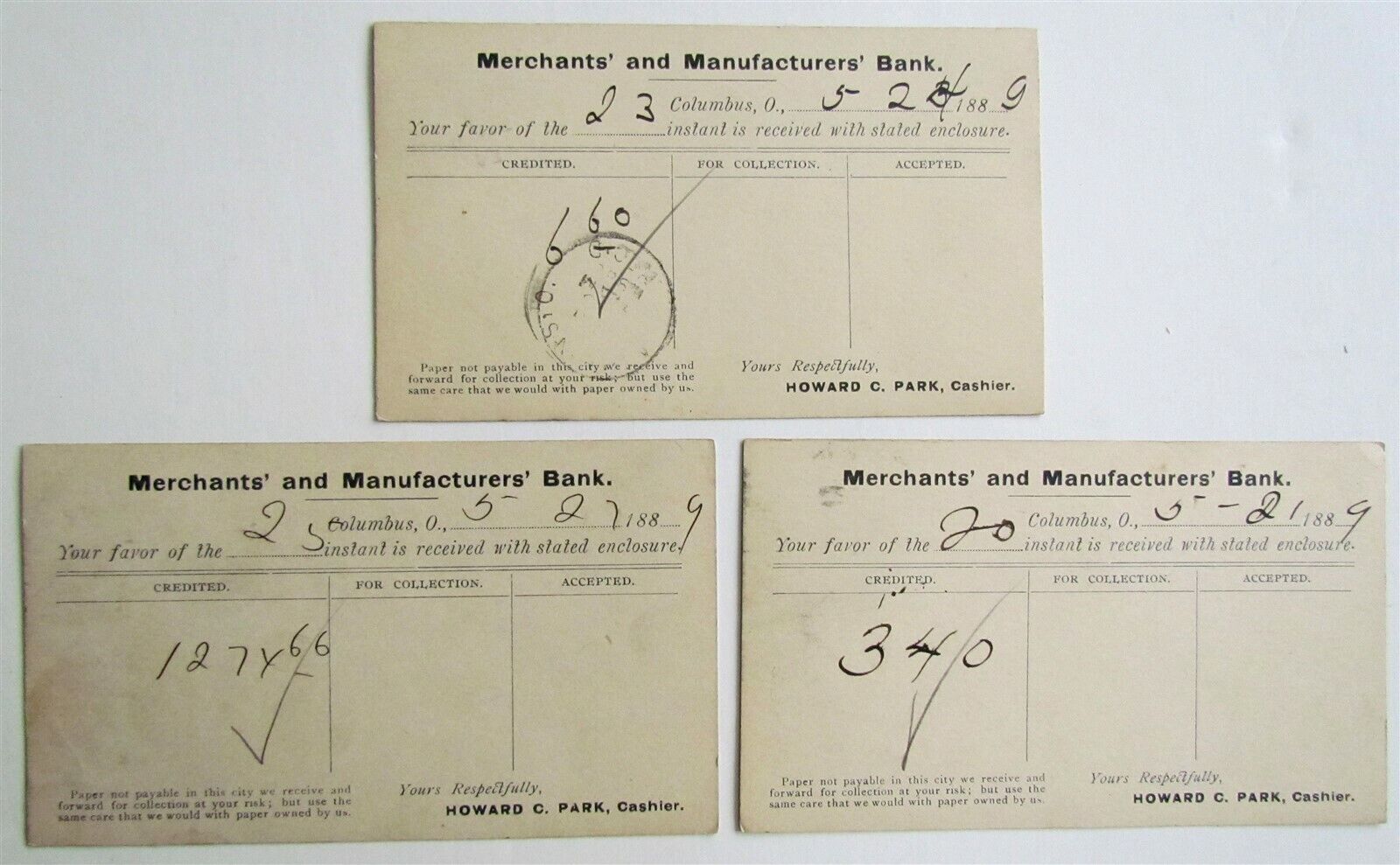 1889 LOT of 3 COLUMBUS OHIO MERCHANT BANK ANTIQUE STATEMENT CARDS POSTCARDS