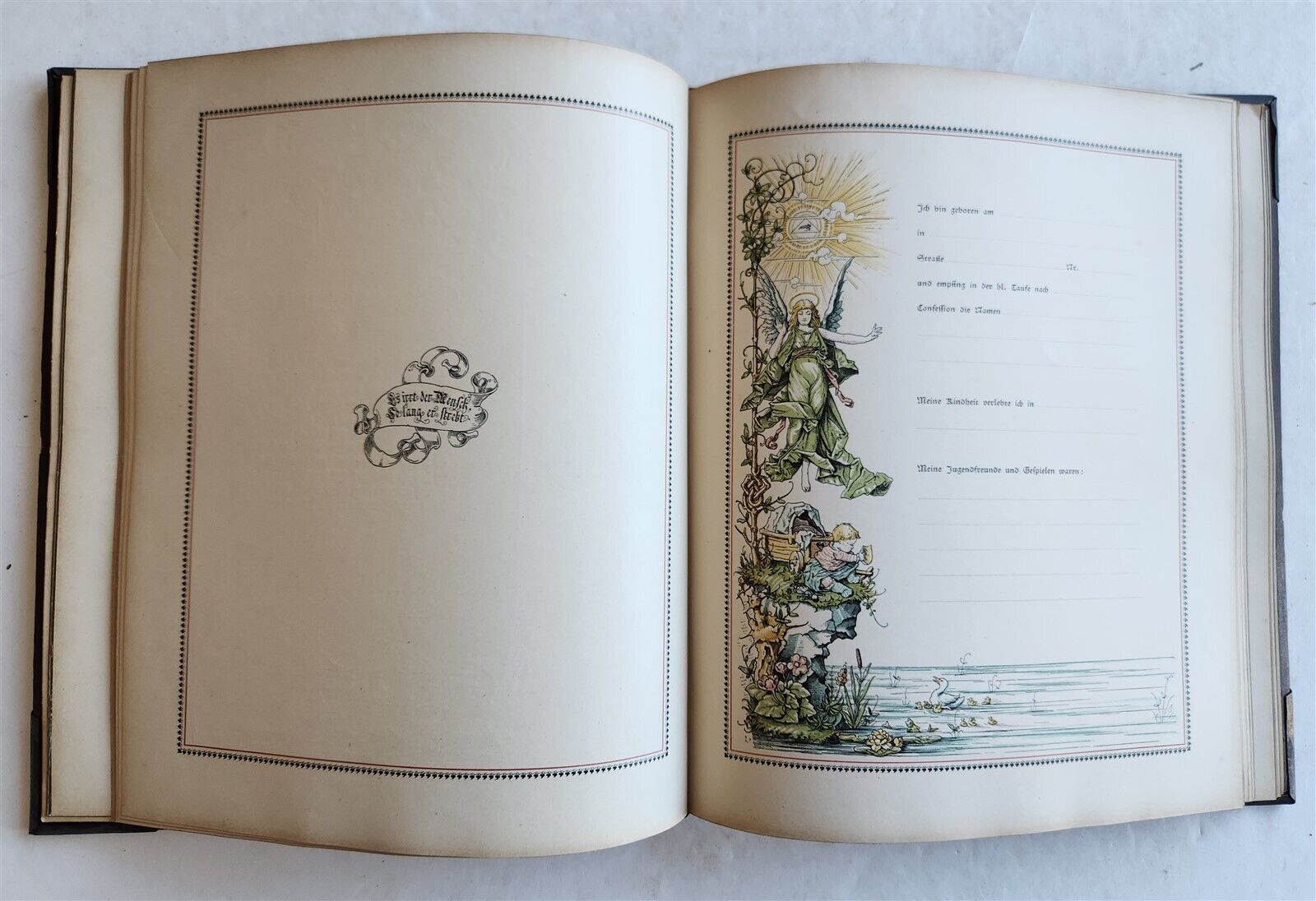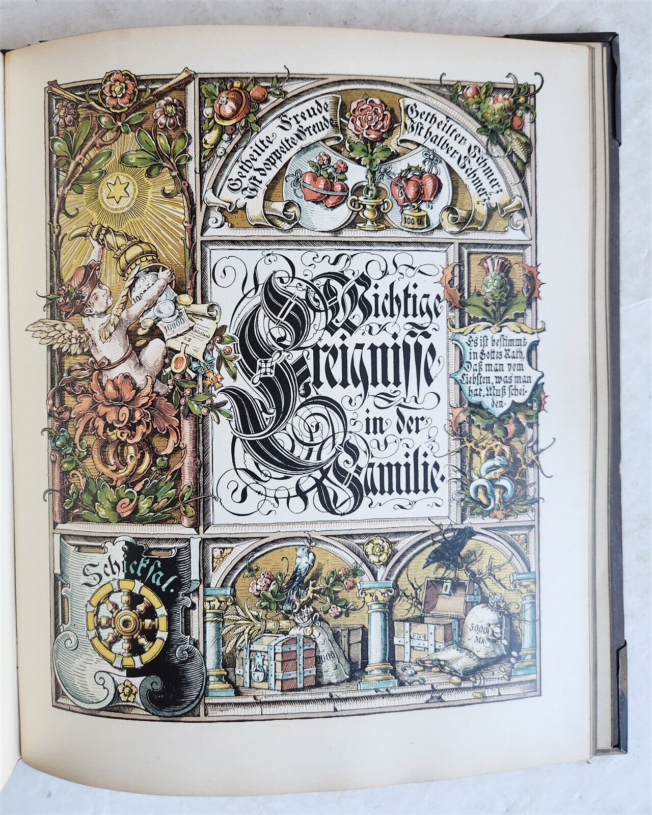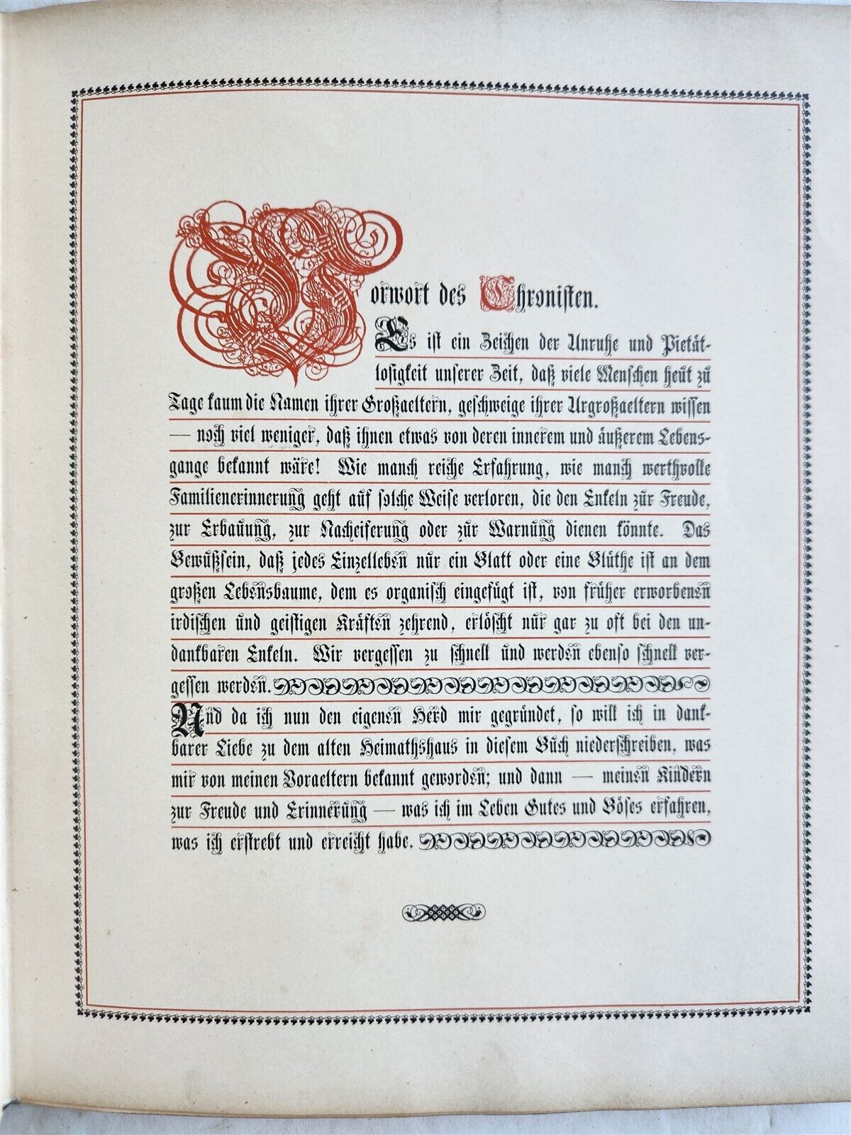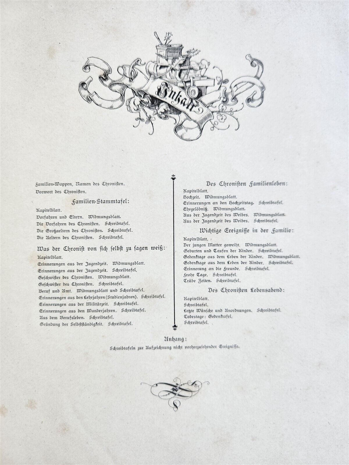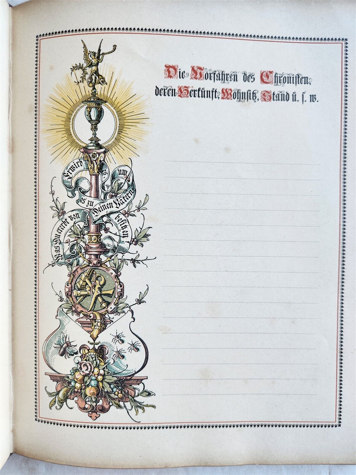 Haus- und Familien-Chronik. Texte von Paul von Zimmermann. Wien, Gerlach u. Schenk; N.D. (c. 1890)With chromolithographed title and 5 chromolithographed subtitles, as well as numerous chromolithographed illustrations and headers by F.X. Weinzierl. Unpaginated.Original richly embossed leather binding with 8 brass corners. Spine renewed with canvas. Minor wear of binding. Otherwise very good condition.Blank template for creating a family register unusedFolio: 10 by 12 inchesText in German===========================