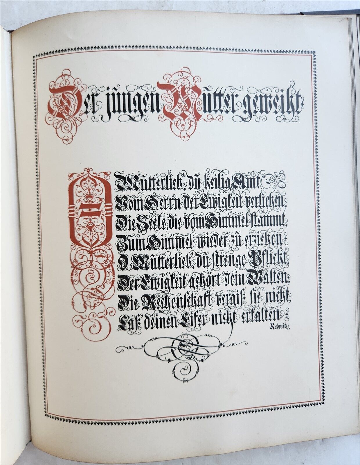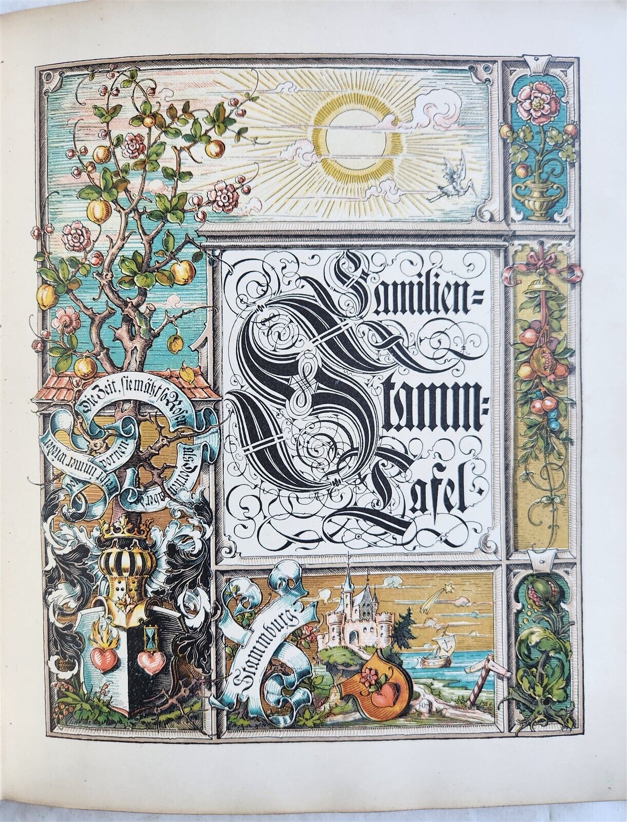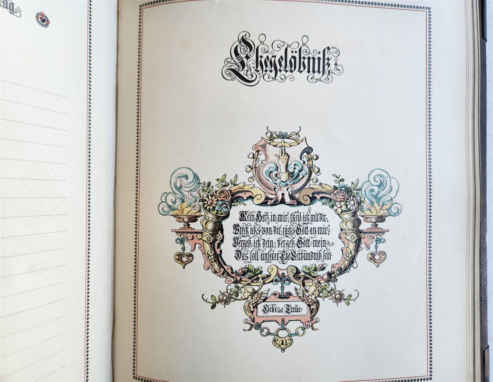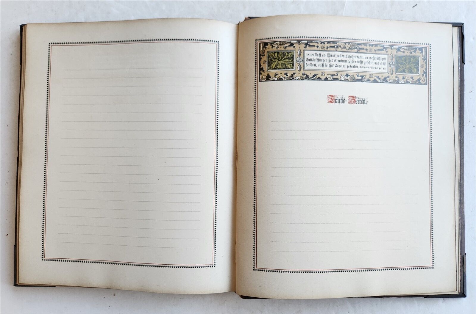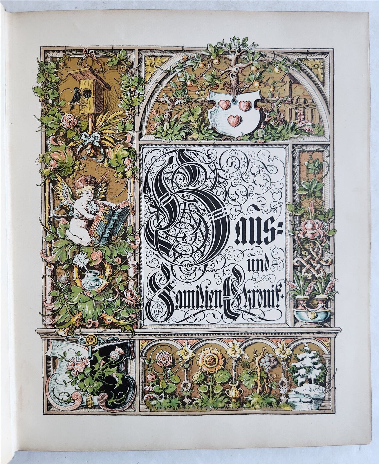 Haus- und Familien-Chronik. Texte von Paul von Zimmermann. Wien, Gerlach u. Schenk; N.D. (c. 1890)With chromolithographed title and 5 chromolithographed subtitles, as well as numerous chromolithographed illustrations and headers by F.X. Weinzierl. Unpaginated.Original richly embossed leather binding with 8 brass corners. Spine renewed with canvas. Minor wear of binding. Otherwise very good condition.Blank template for creating a family register unusedFolio: 10 by 12 inchesText in German===========================