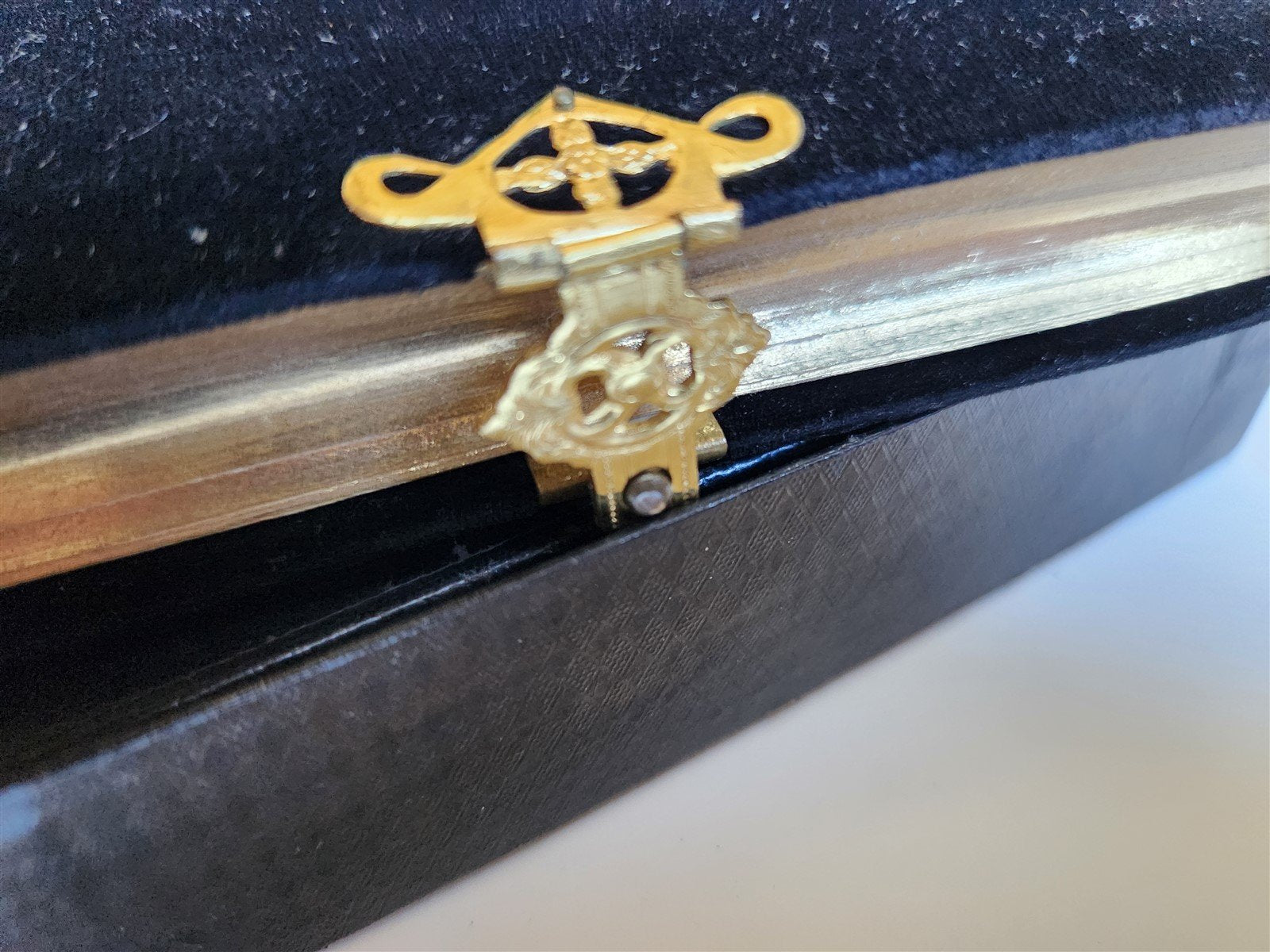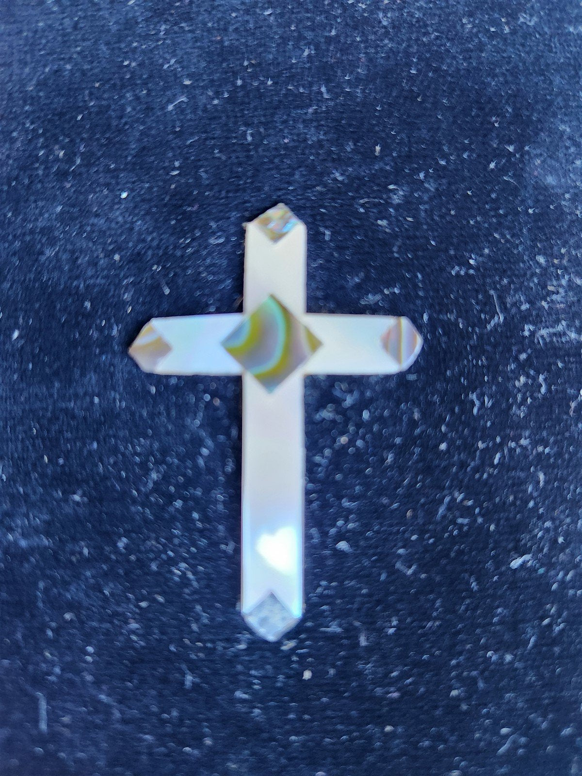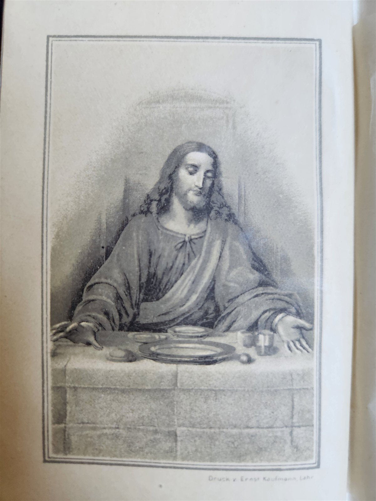 Beautiful velvet binding with applied mother-of-pearl cross. Intact clasp. Brass title label at the spine.