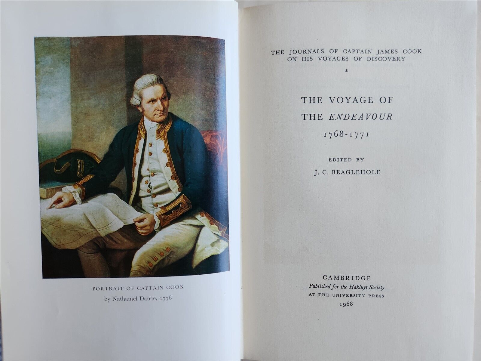 Cook (James). The Journals of Captain James Cook on his Voyages of Discovery, edited by J. C. Beaglehole 5 text volumes (lacking the atlas volume) mixed editions)Cambridge: University Press for the Hakluyt Society, 1967-74 volumes I-II from 1968 plates, folding maps and illustrations, original cloth gilt, dust jackets, a few small tears and marks, minor wear together with :Cook and the Russians, addendum pamphlet, 1973Size 6.5 by 9.5"Text in English==================================Please see my other auctions Thank You