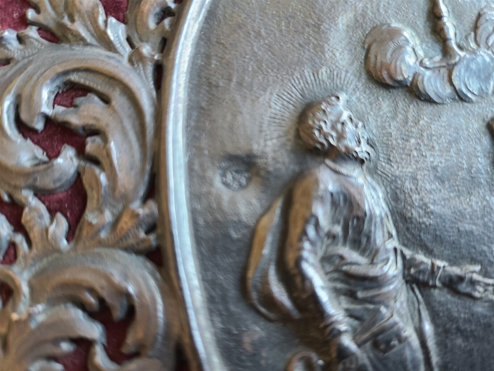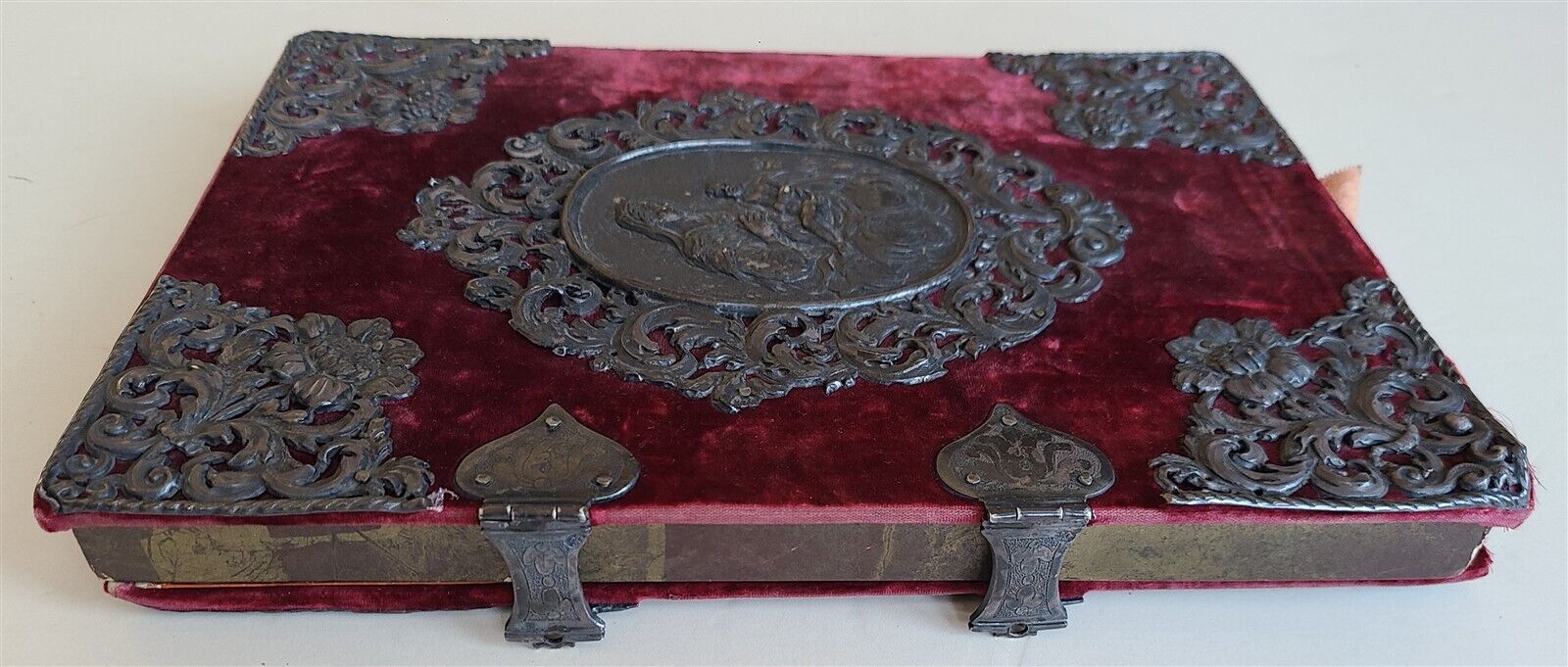Antique Italian Silver Mounted Bible Case 19th centurySize 12 x 9 x 1.5'' Repousse medallions of madonna with child and saints. With clasps.Hallmarks on silver resemble the Vatican Keys of Heaven. Red velvet body with leather interior. Good condition===============================================Please see my other auctions Thank You