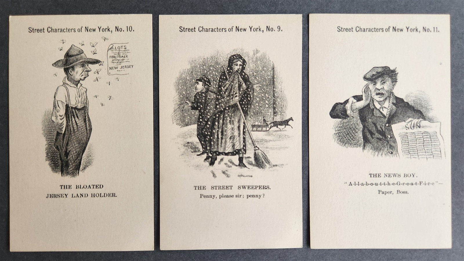 3 ANTIQUE VICTORIAN TRADE CARDS BROOKLYN TAILOR - STREET CHARACTERS of NEW YORK