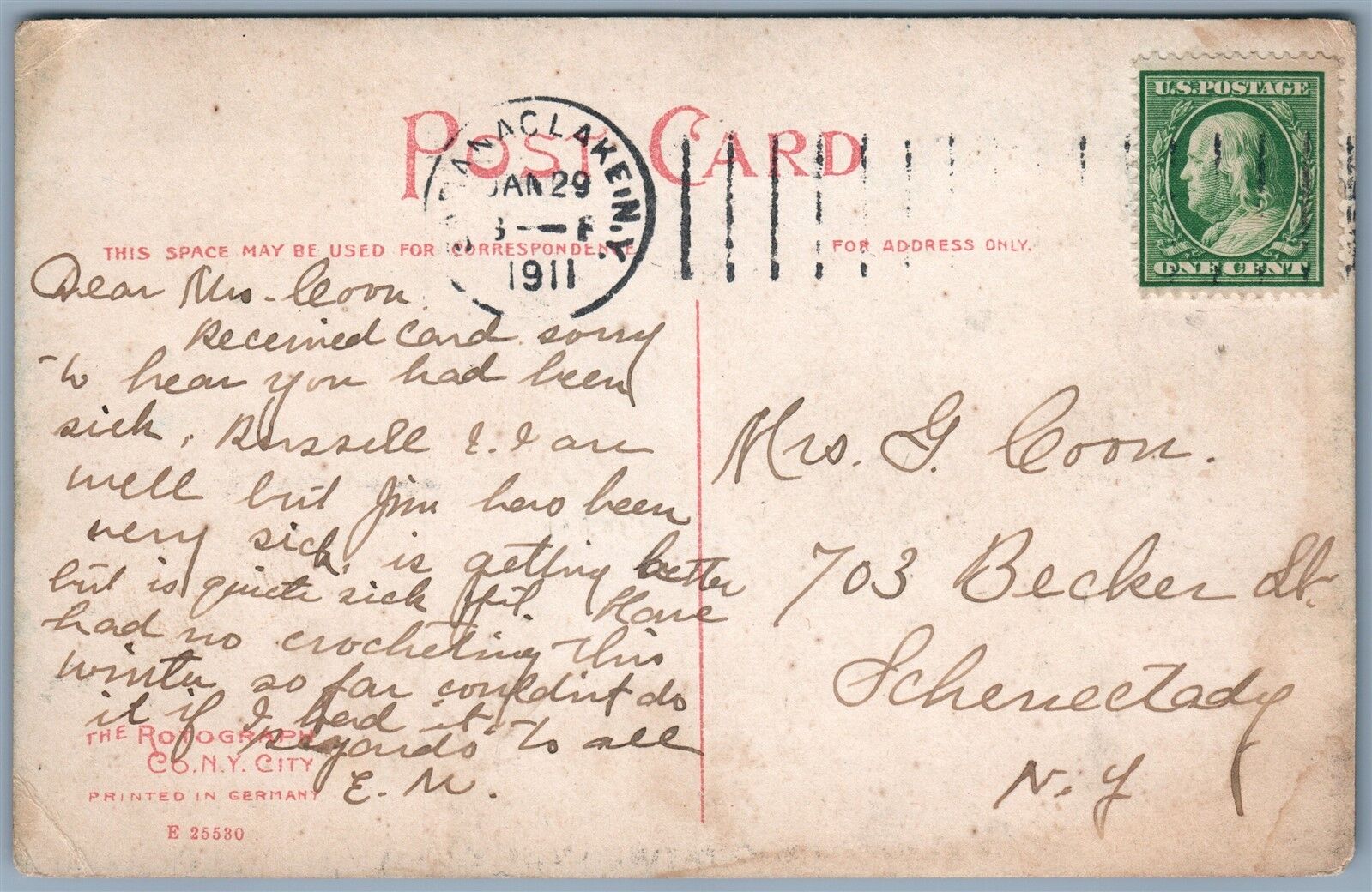 ADIRONDACK MTS NY SARANAC LAKE VILLAGE 1911 ANTIQUE POSTCARD
