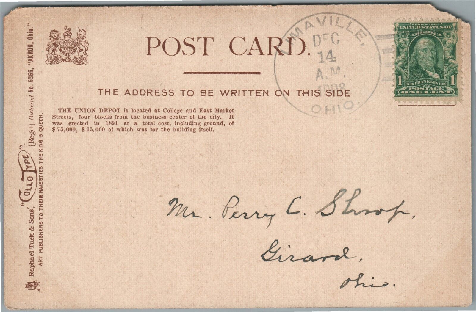 AKRON OH UNION RAILROAD STATION RAILWAY DEPOT 1908 ANTIQUE POSTCARD