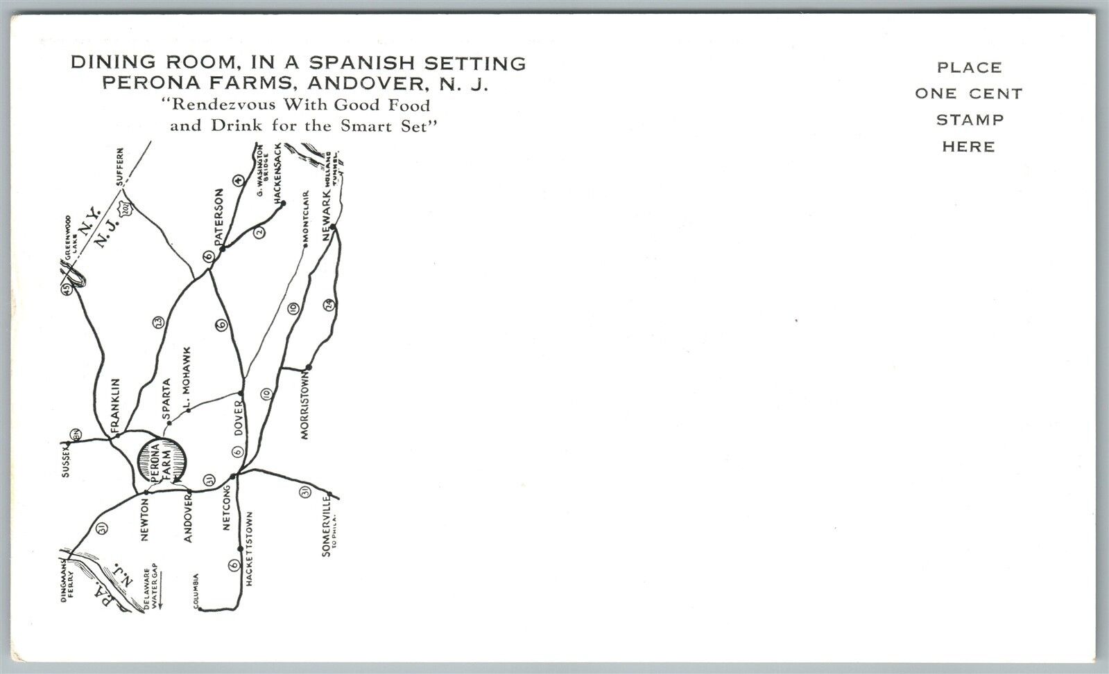 ANDOVER NJ PERONA FARMS DINING ROOM in SPANISH SETTING w/ MAP ANTIQUE POSTCARD