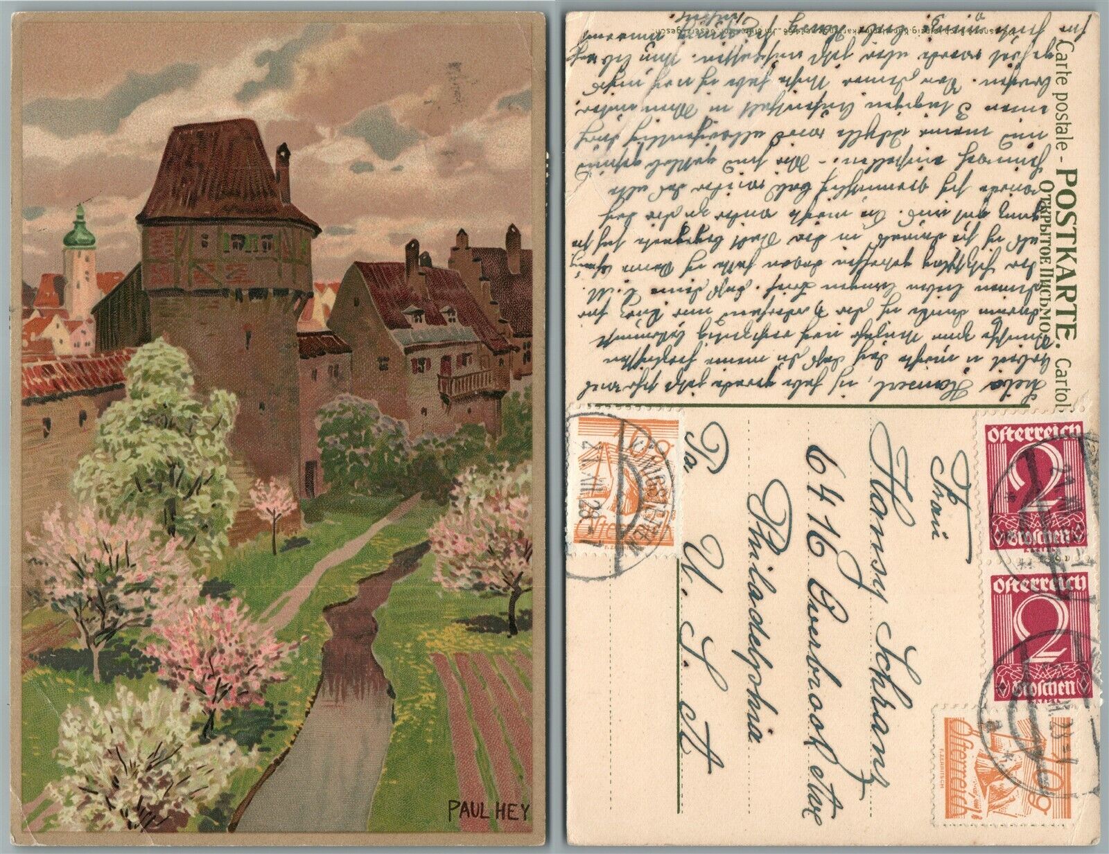 AUSTRIAN ANTIQUE ARTIST SIGNED POSTCARD w/ STAMPS PAUL HEY