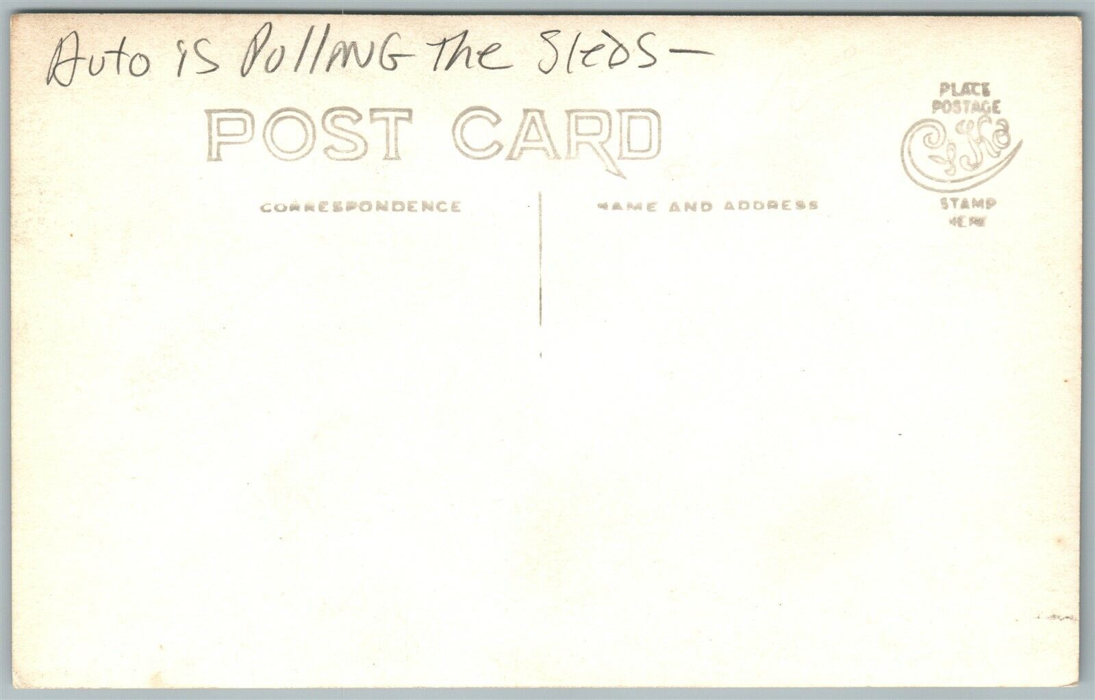 AUTOMOBILE PULLING THE SLEDS in SNOW ANTIQUE REAL PHOTO POSTCARD RPPC