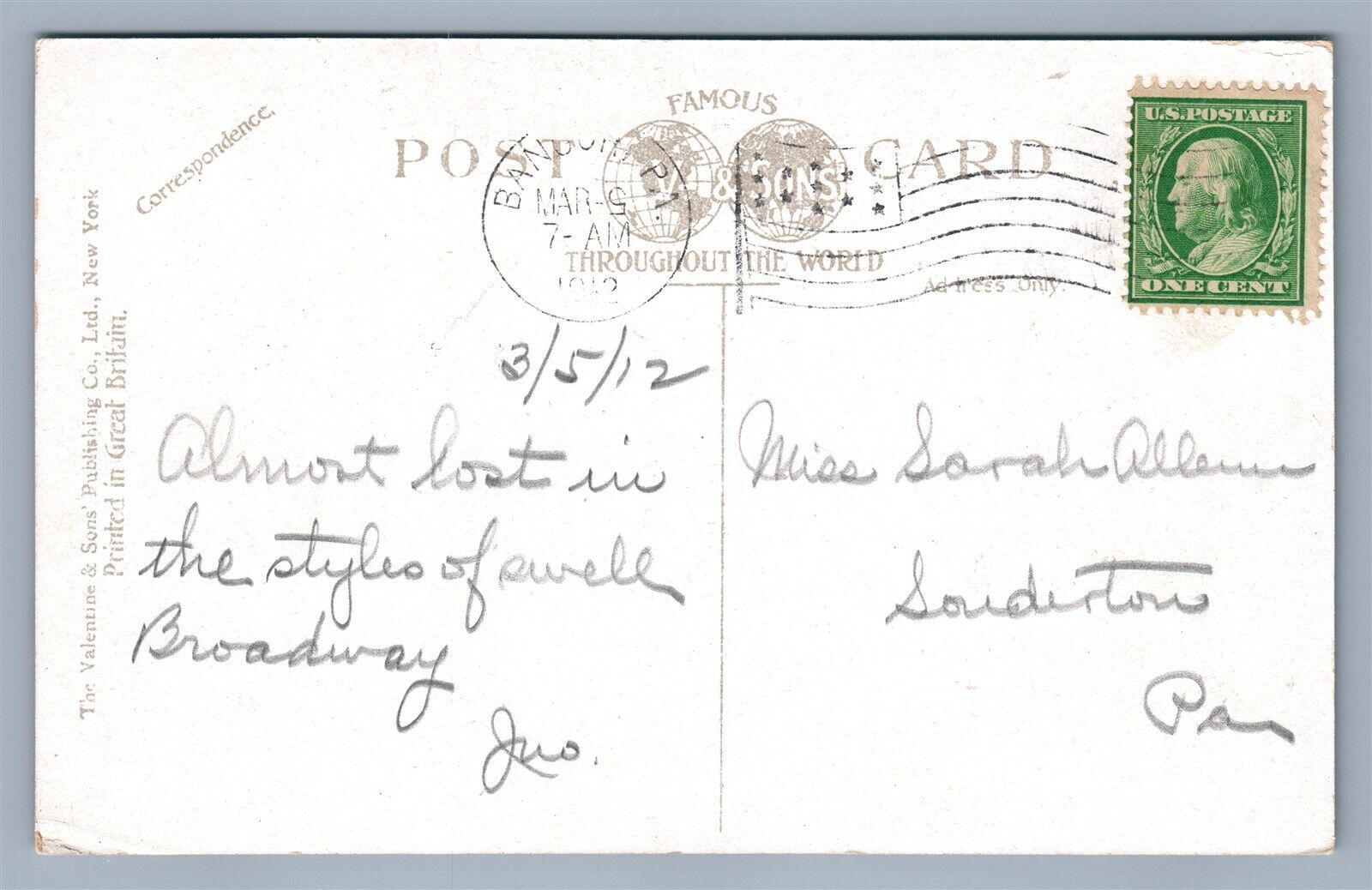 BANGOR PA BROADWAY 1912 ANTIQUE POSTCARD