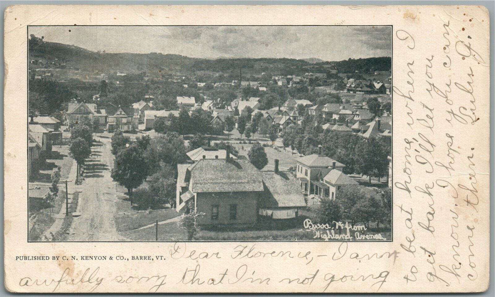 BARRE VT FROM HIGHLAND AVENUE ANTIQUE POSTCARD
