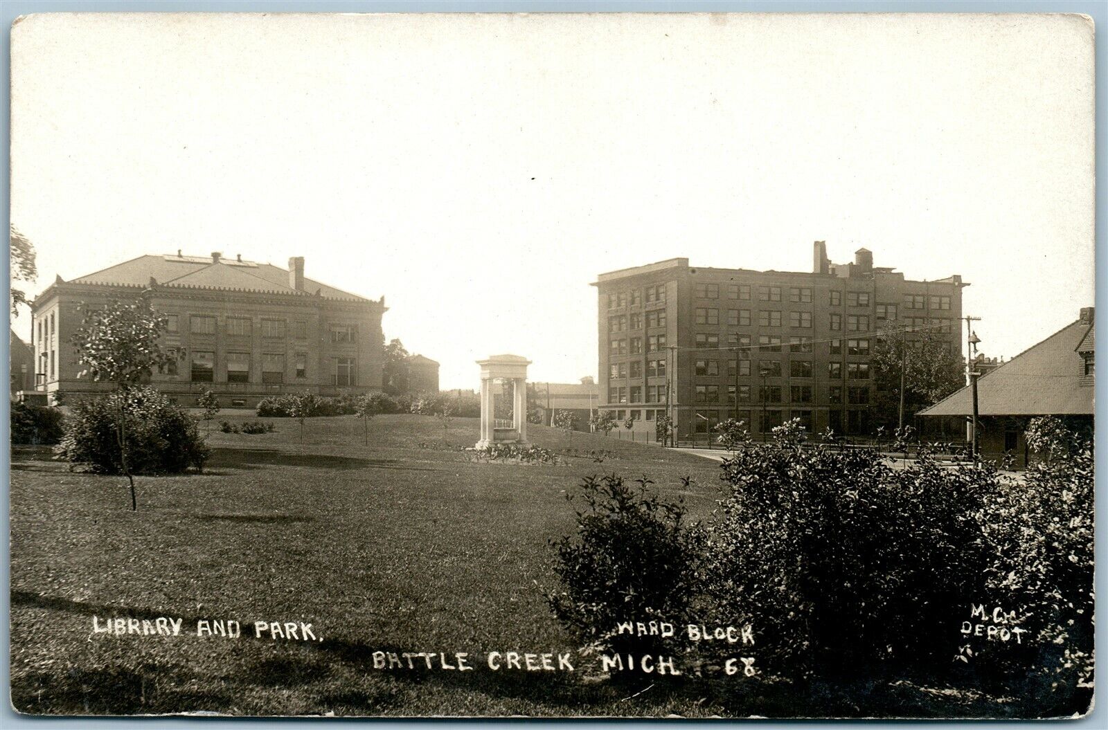BATTLE CREEK MI LIBRARY & PARK ANTIQUE REAL PHOTO POSTCARD RPPC