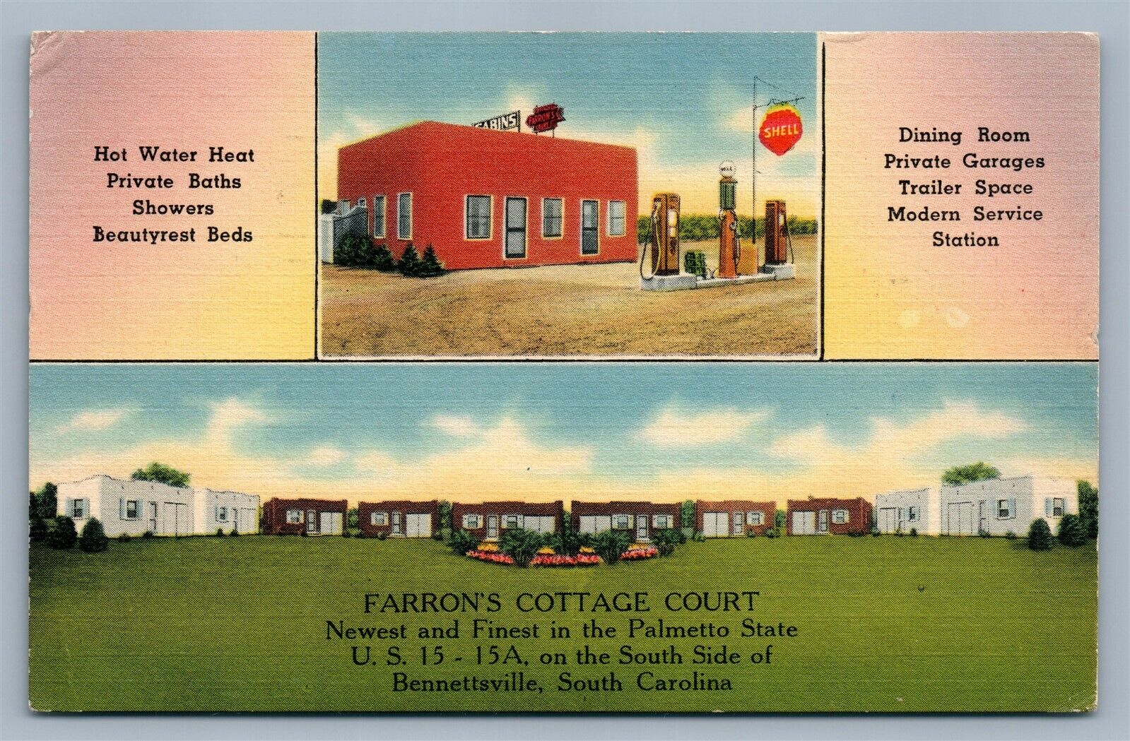 BENNETTSVILLE SC SHELL GAS STATION FARRON'S COTTAGE COURT 1942 VINTAGE POSTCARD