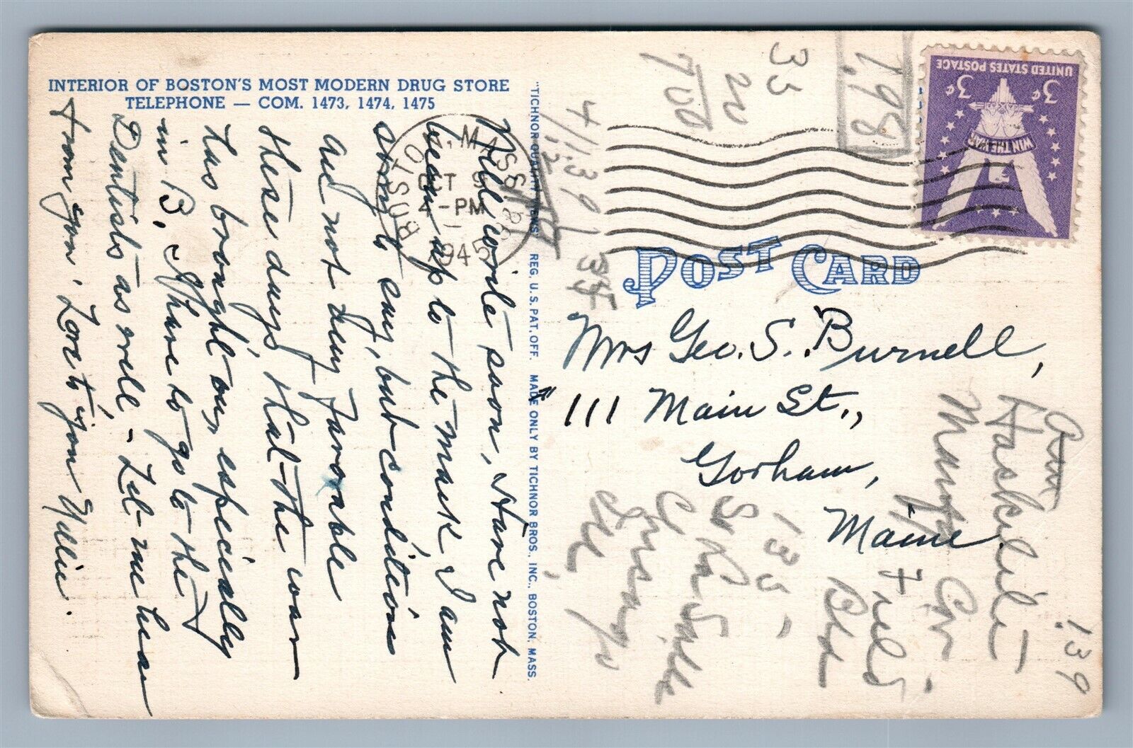 BOSTON MA KENMORE PHARMACY COMMONWEALTH AVE. VINTAGE 1945 POSTCARD
