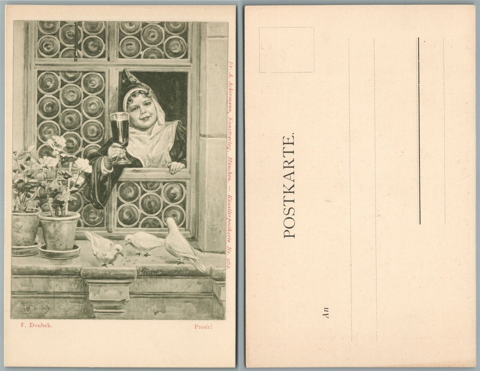 BOY w/ WINE GLASS GERMAN ANTIQUE POSTCARD ARTIST SIGNED F.DOUBEK