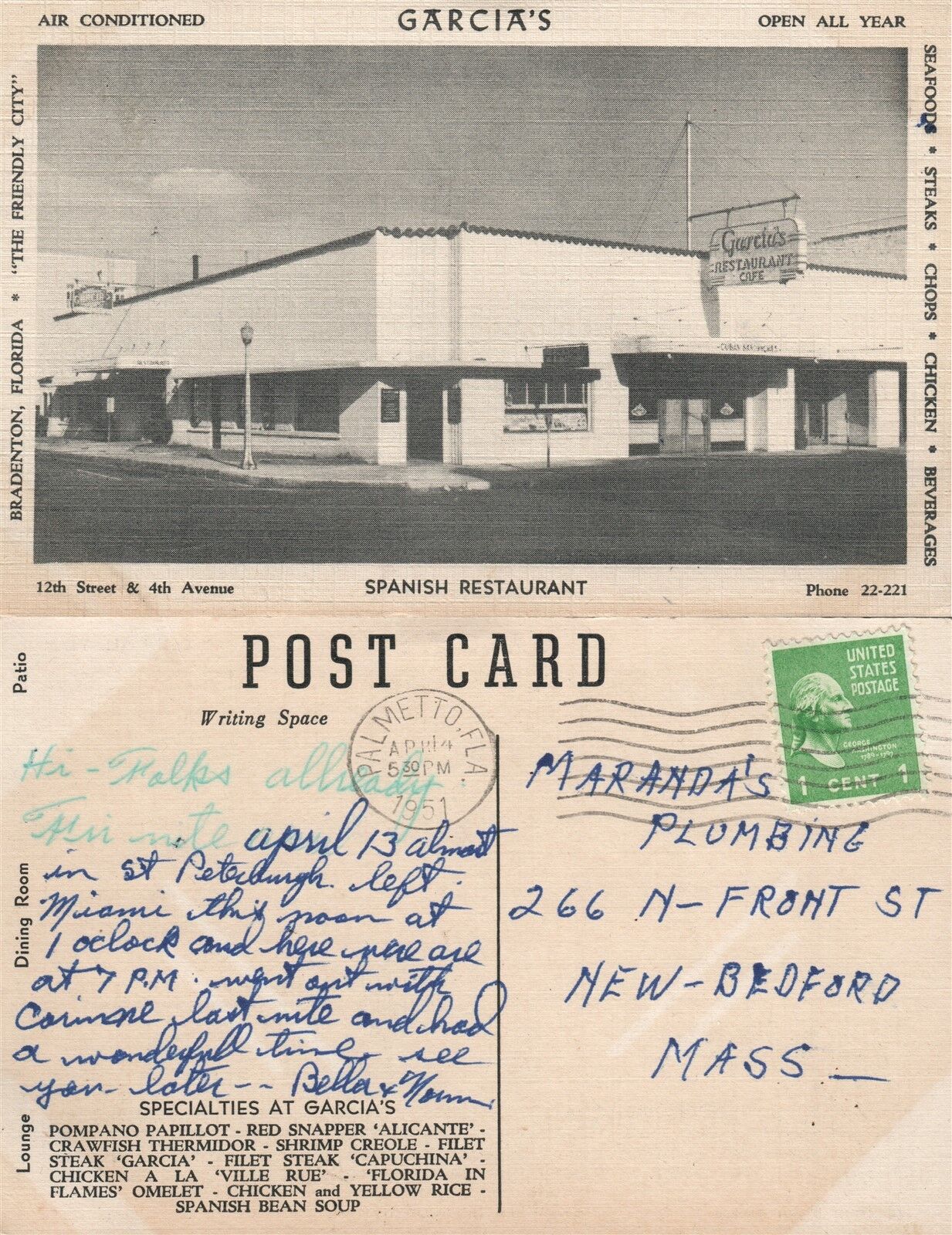 BRADENTON FL SPANISH RESTAURANT GARCIA 1951 ADVERTISING VINTAGE POSTCARD