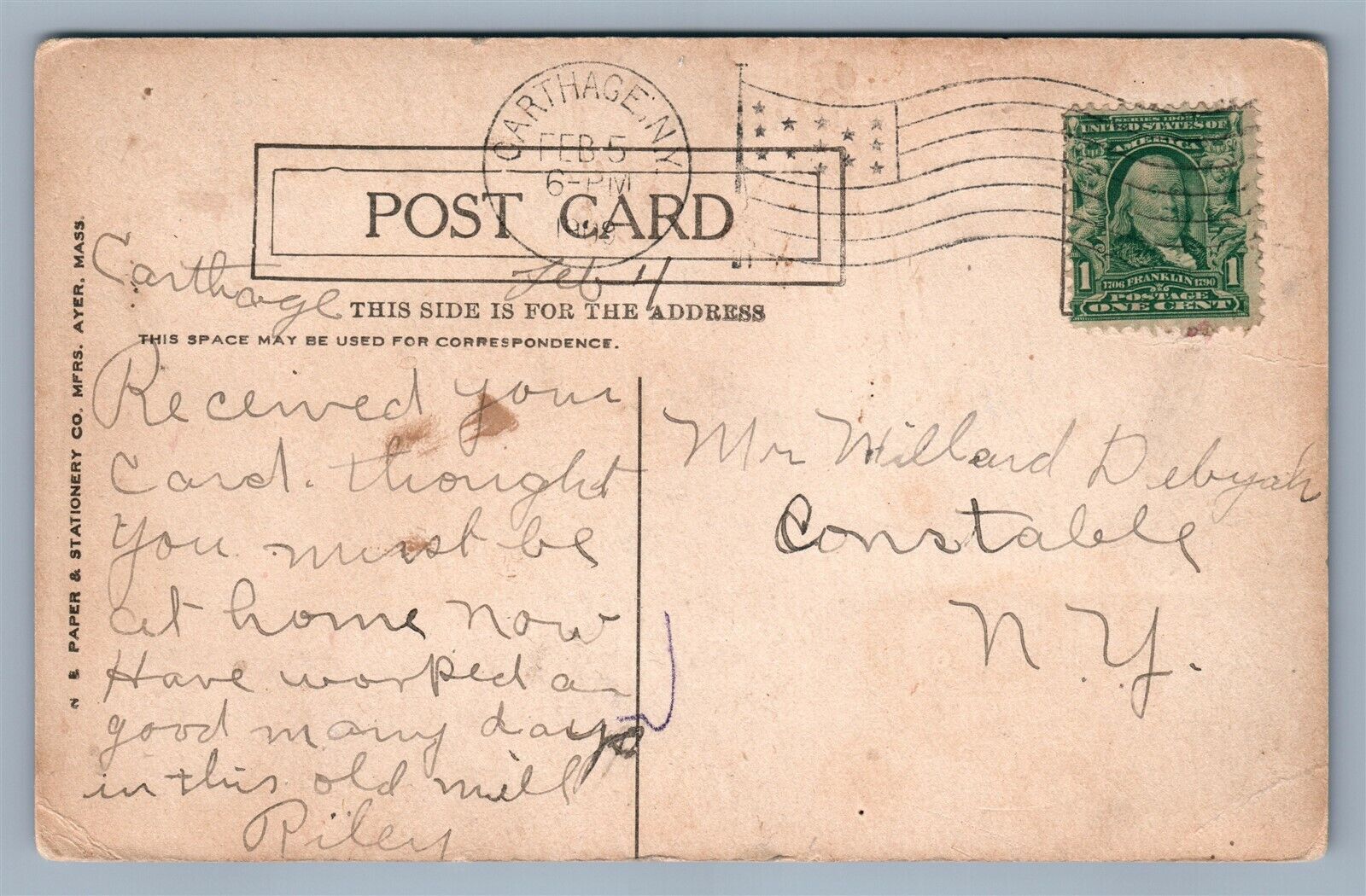 CARTHAGE NY LeROY MILL 1909 ANTIQUE POSTCARD