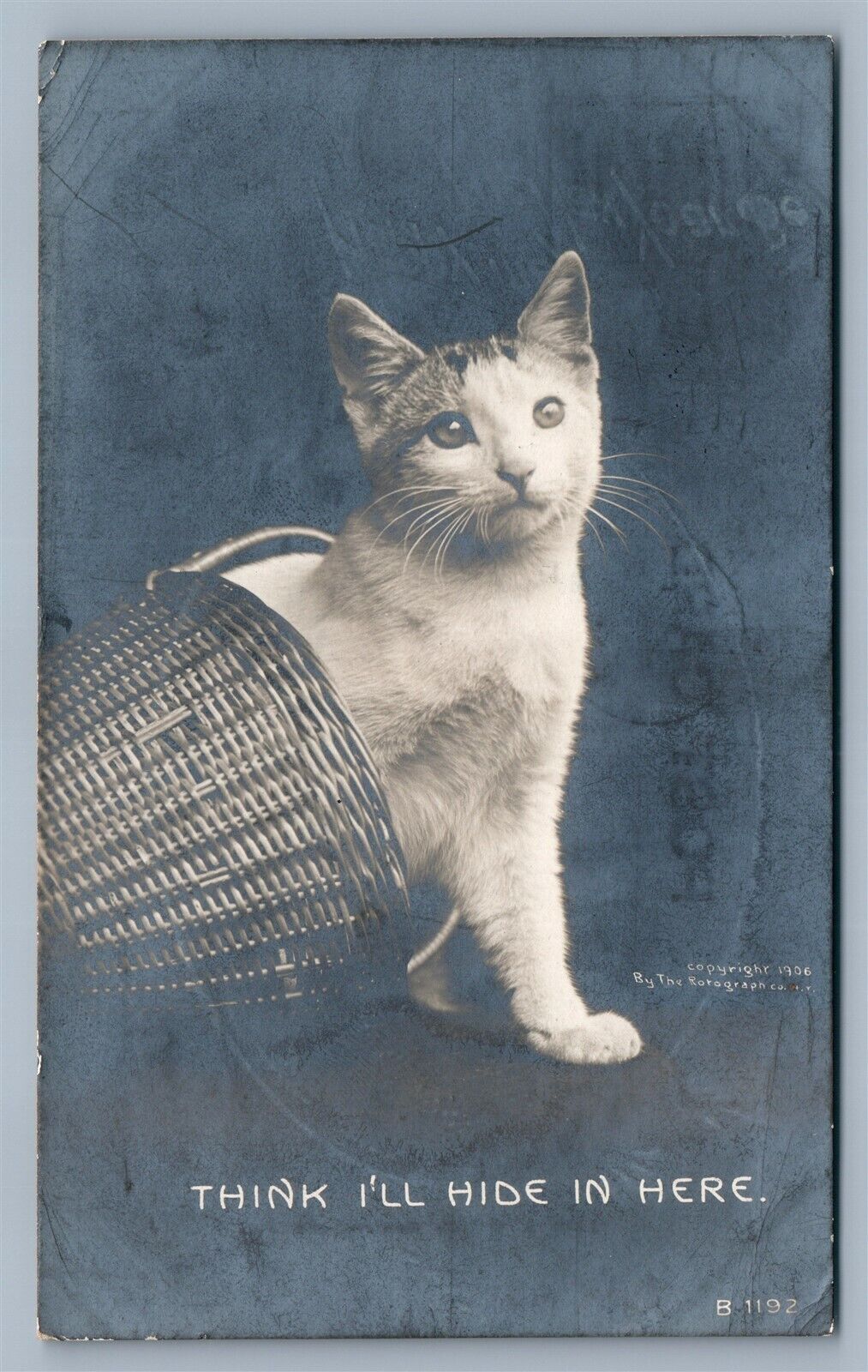 CAT IN BASKET ANTIQUE REAL PHOTO POSTCARD RPPC I THINK I'LL HIDE IN HERE