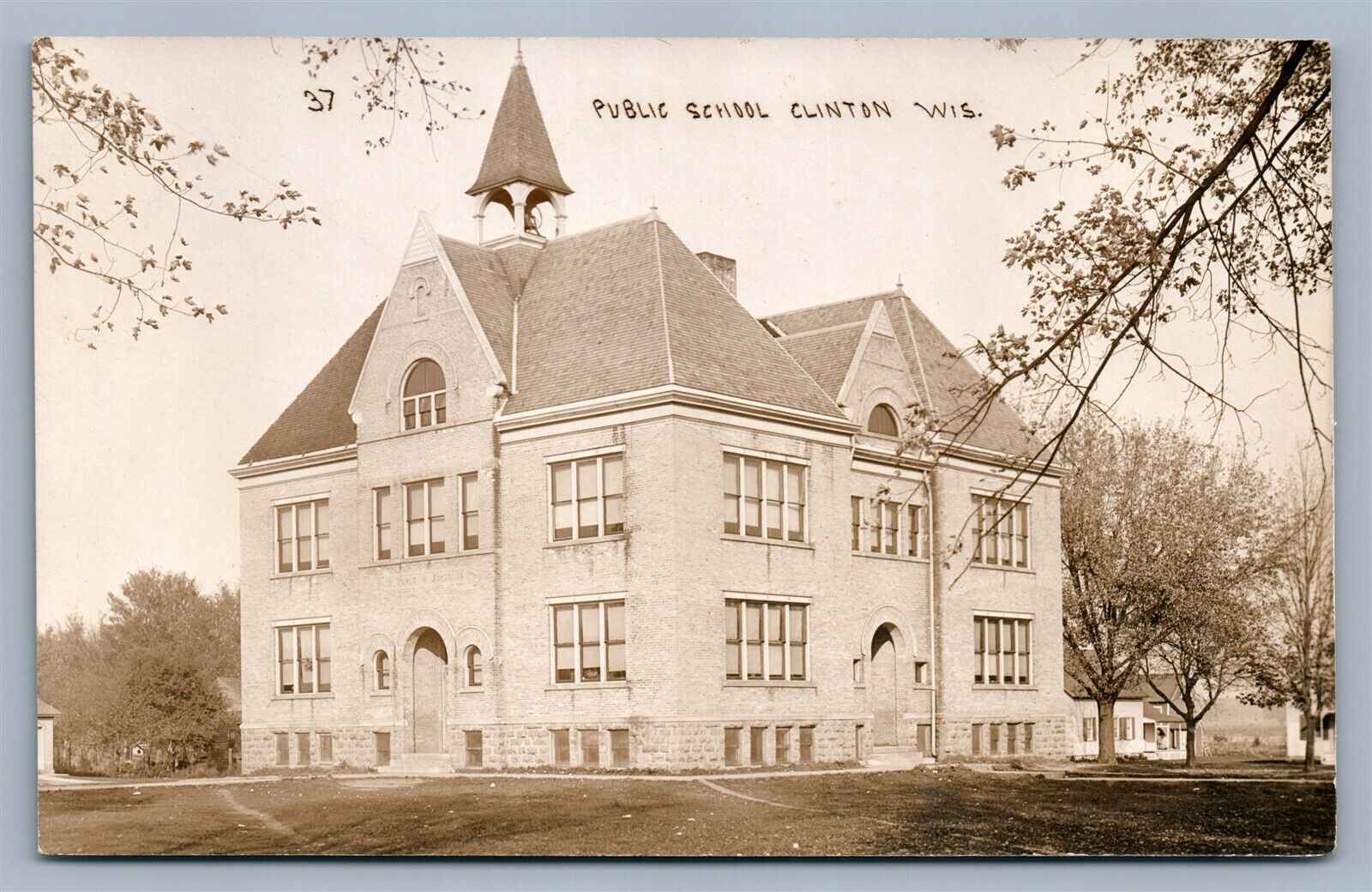 CLINTON WI PUBLIC SCHOOL ANTIQUE REAL PHOTO POSTCARD RPPC w/ CORK CANCEL