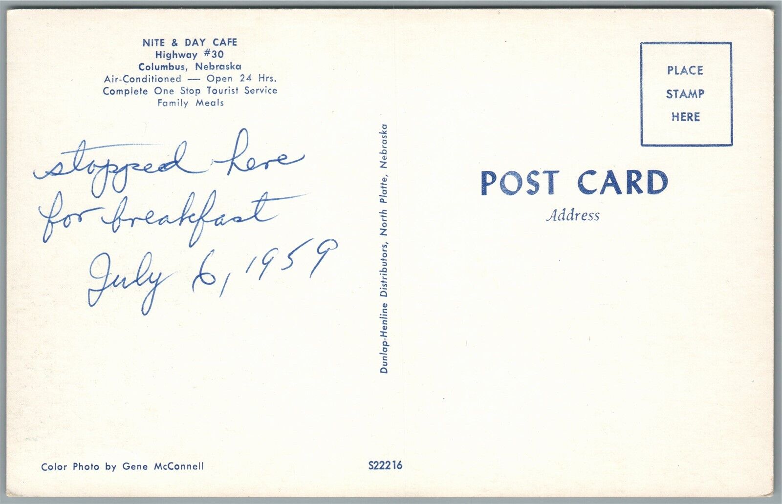 COLUMBUS NE NITE & DAY CAFE VINTAGE POSTCARD