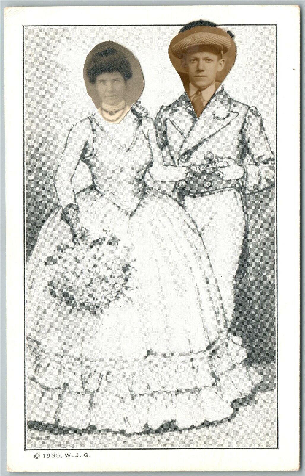 COUPLE w/ PASTE ON FACES FOTOFUN 1935 PHOTOMONTAGE VINTAGE POSTCARD