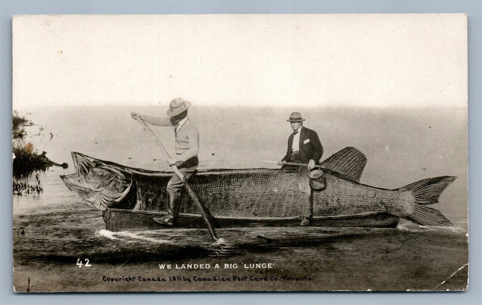EXAGGERATED FISH CANADA ANTIQUE REAL PHOTO POSTCARD RPPC fishing