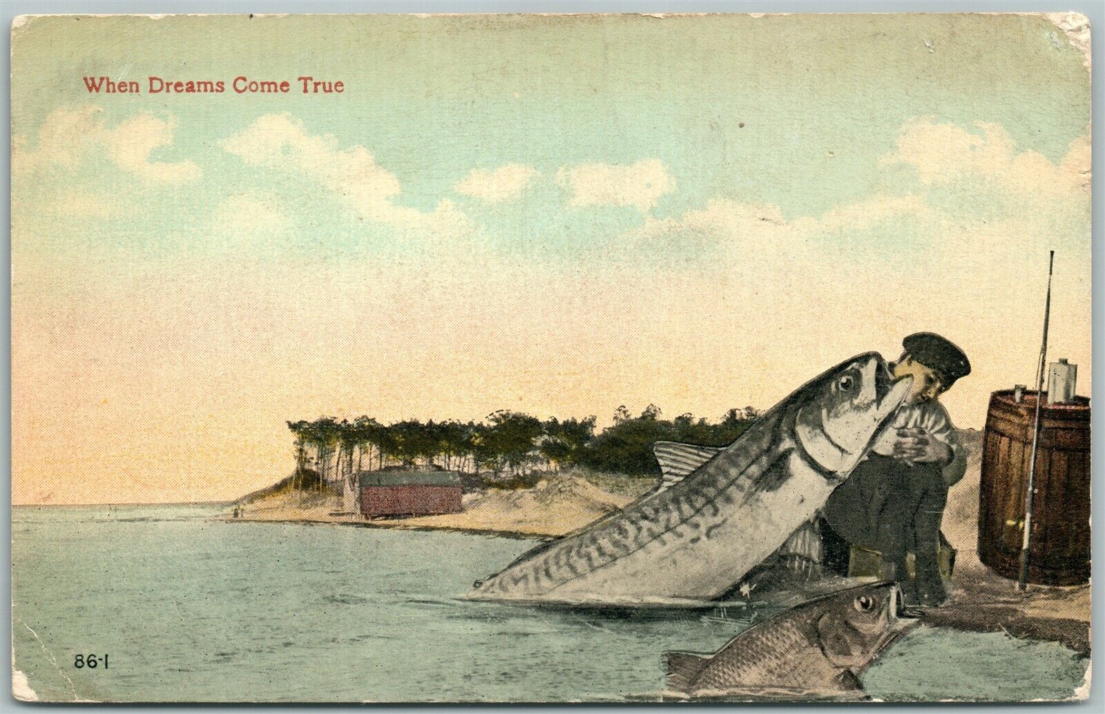 EXAGGERATED FISHING ANTIQUE POSTCARD CANADA POSTAGE WAR TAX STAMPS