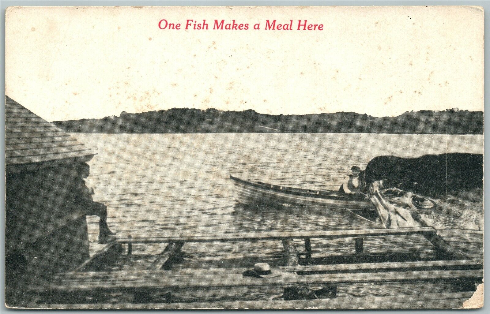EXAGGERATED FISHING ANTIQUE POSTCARD FISH MAKES A MEAL HERE