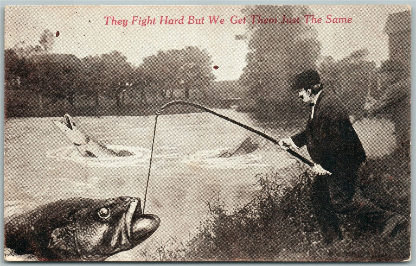 EXAGGERATED FISHING ANTIQUE POSTCARD THEY FIGHT HARD