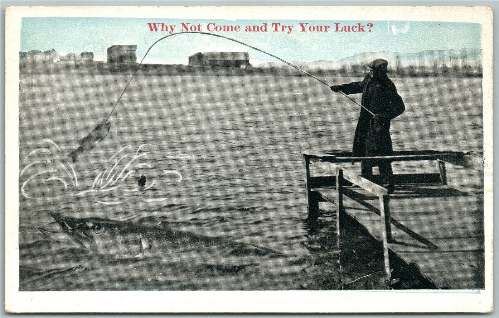 EXAGGERATED FISHING ANTIQUE POSTCARD WHY NOT TRY YOUR LUCK?