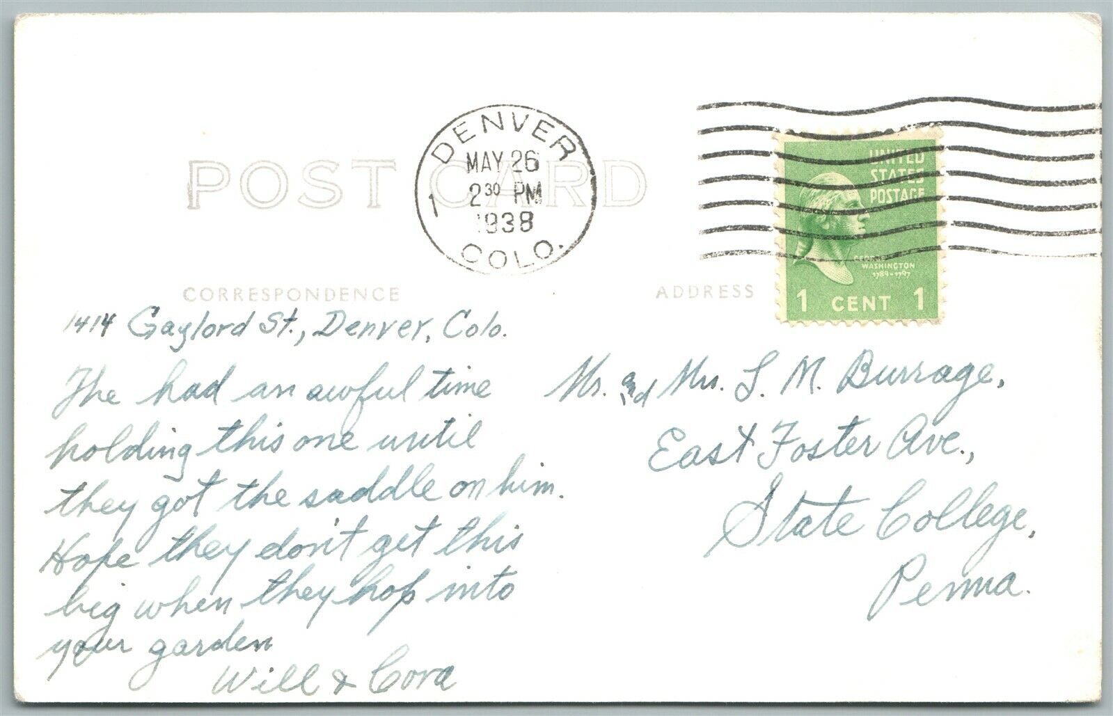 EXAGGERATED GRASSHOPPER on RAILROAD TRACKS 1938 VINTAGE REAL PHOTO POSTCARD RPPC