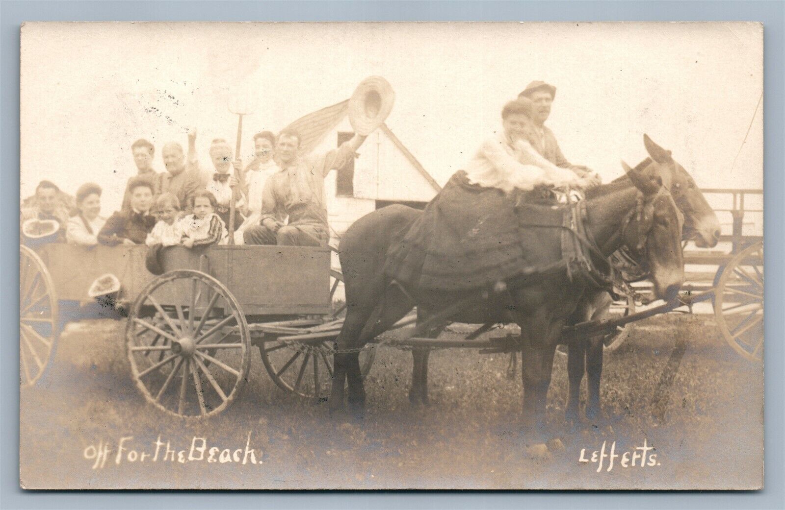 FAMILY COMING FROM BEACH in HORSE CART GROUP ANTIQUE REAL PHOTO POSTCARD RPPC