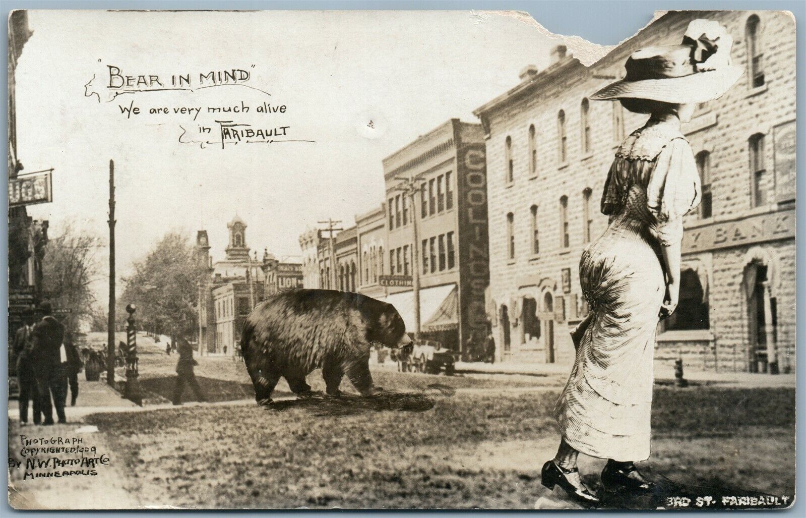 FARIBAULT MN 3rd STREET SCENE w/ BEARS 1909 ANTIQUE PHOTOMONTAGE REAL PHOTO RPPC