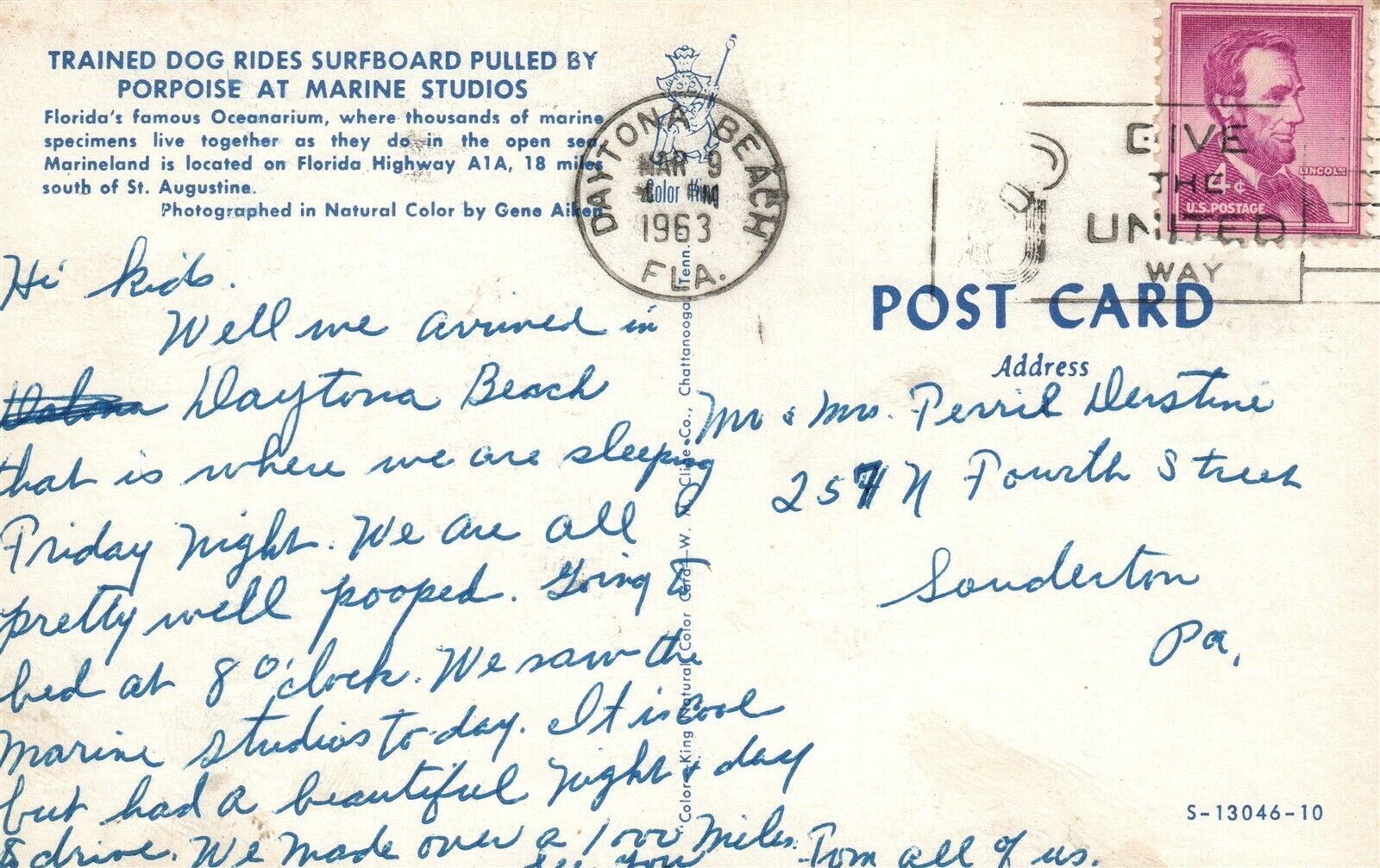 FLORIDA OCEANARIUM TRAINED DOG RIDES SURFBOARD 1963 VINTAGE POSTCARD