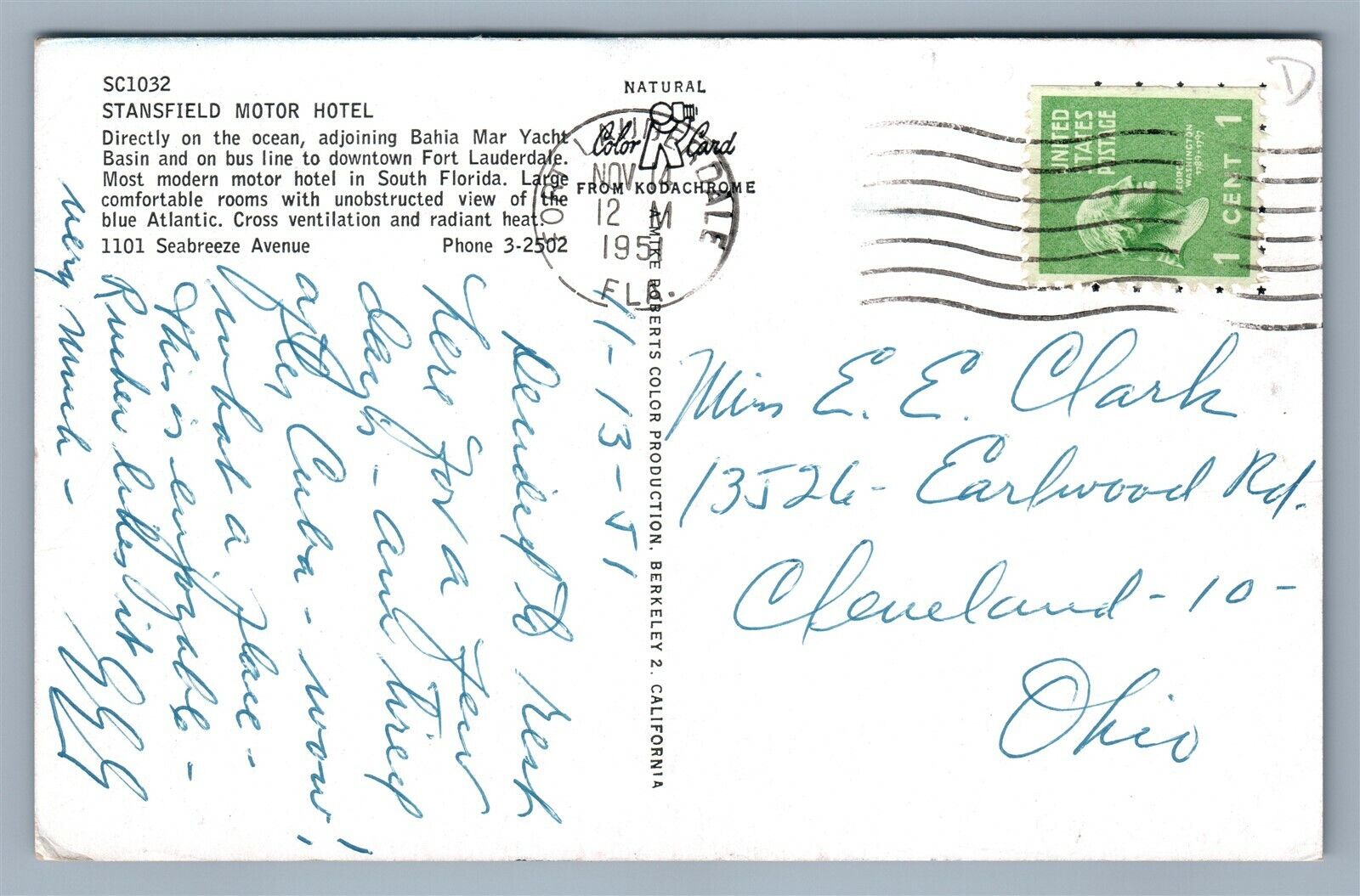 FORT LAUDERDALE FL STANSFIELD MOTOR HOTEL ADVERTISING VINTAGE POSTCARD