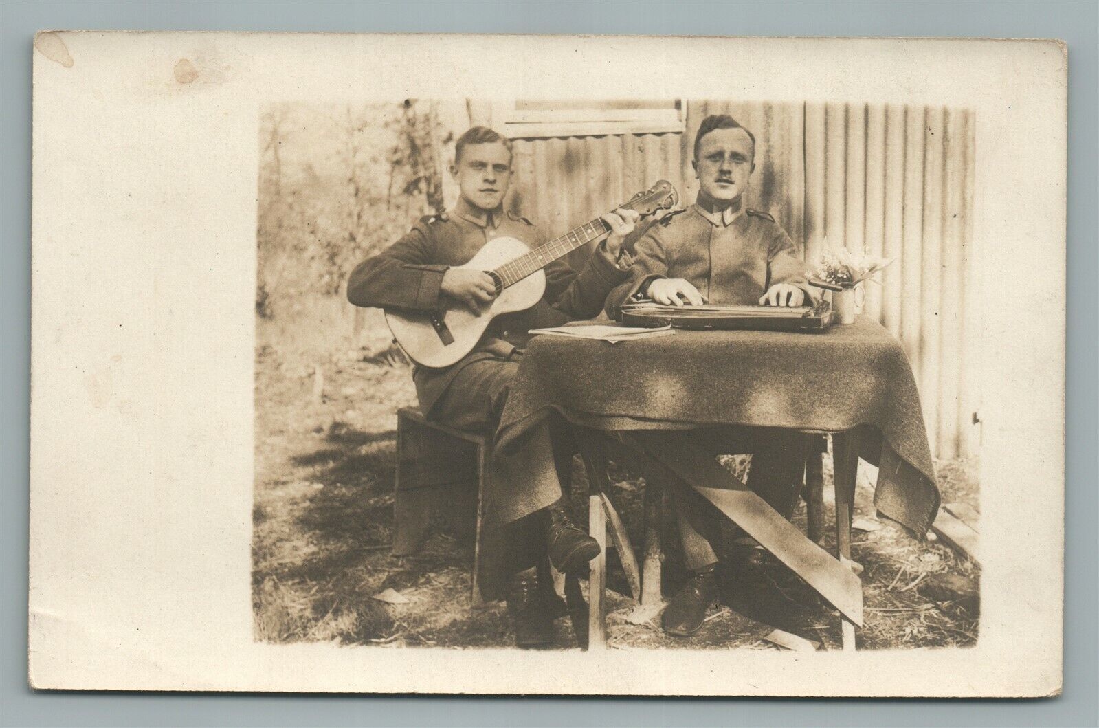 GERMAN WWI ERA SOLDIER w/ GUITAR & FLOWERS ANTIQUE REAL PHOTO POSTCARD RPPC
