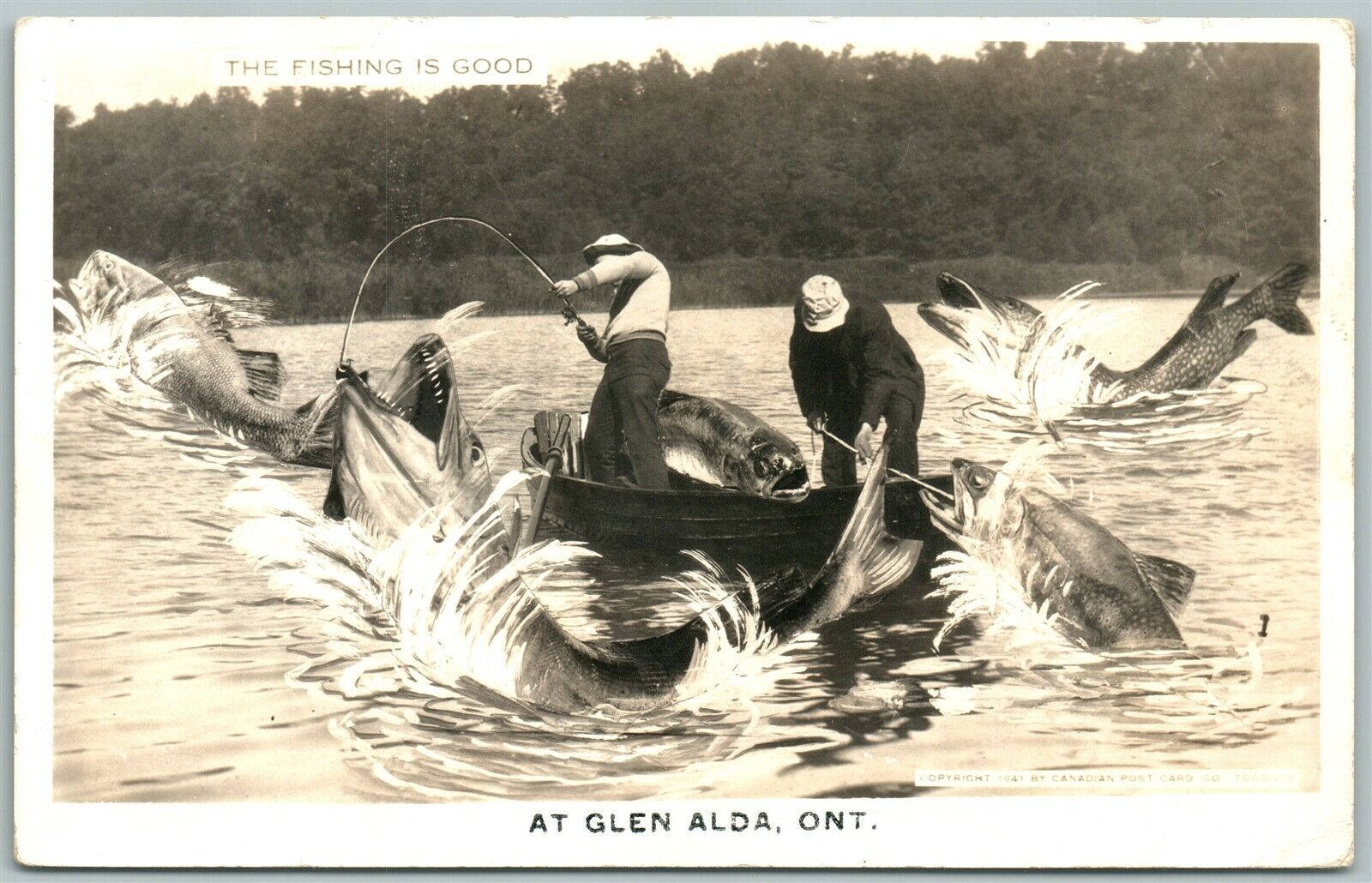 GLEN ALDA ONTARIO CANADA EXAGGERATED FISHING VINTAGE REAL PHOTO POSTCARD RPPC