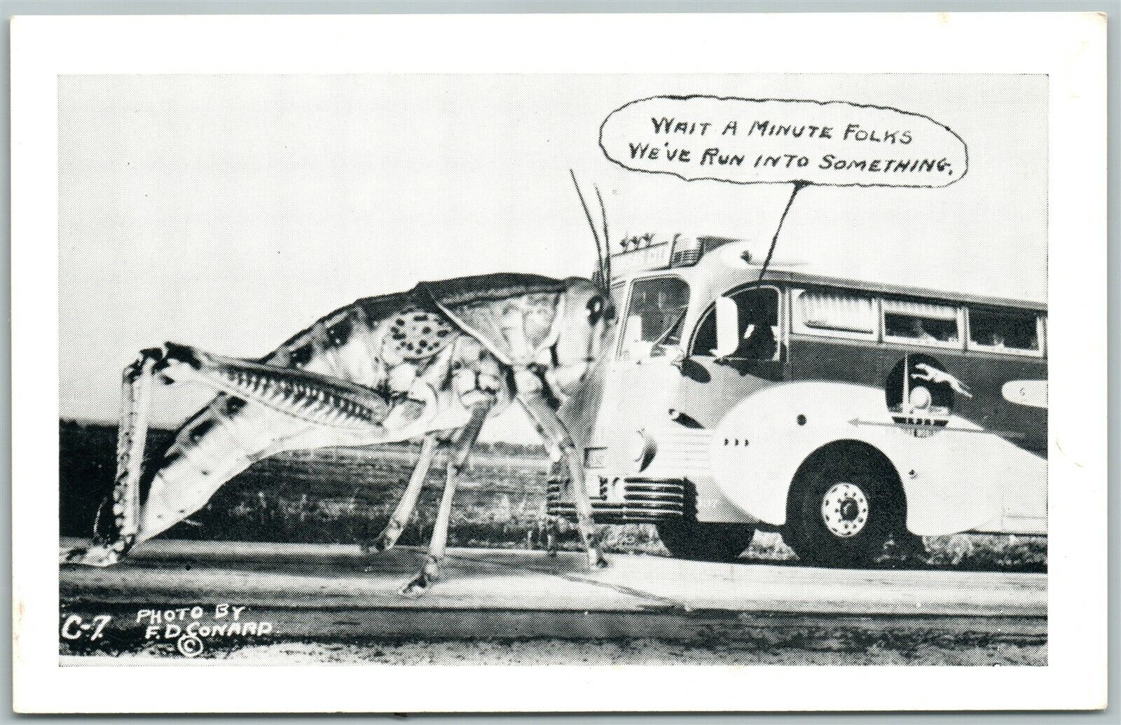 GRASSHOPPER EXAGGERATED ANTIQUE ADVERTISING POSTCARD BUS CAR