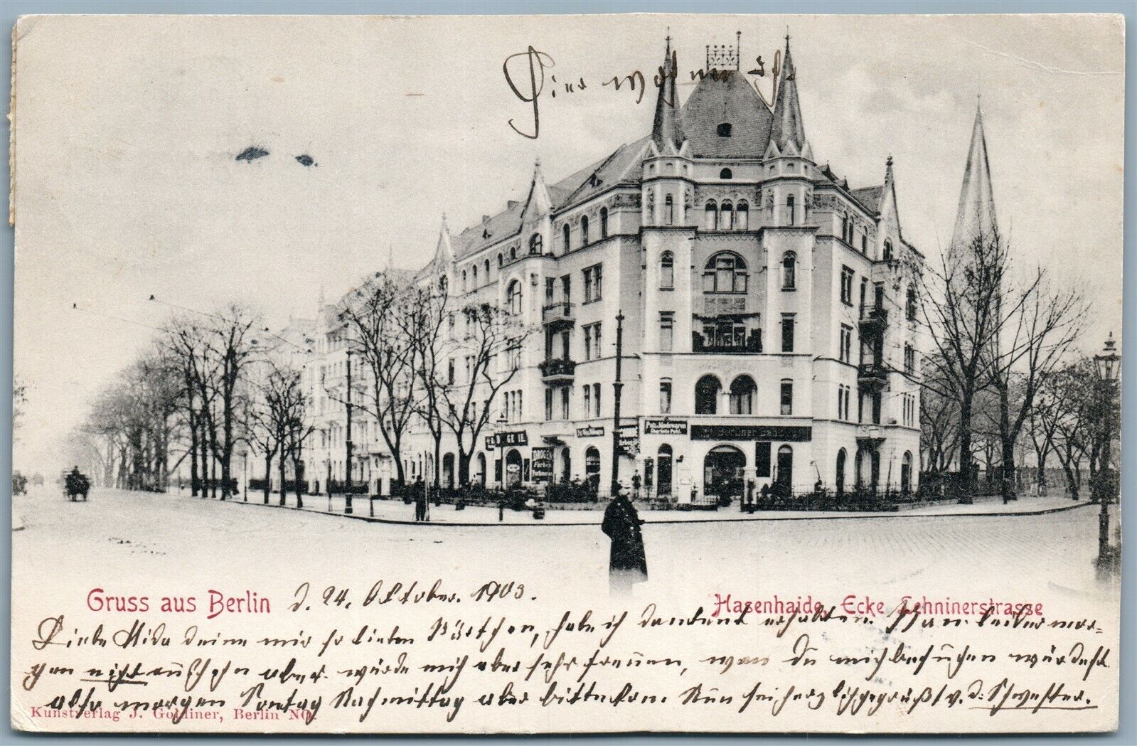 GRUSS AUS BERLIN GERMANY HASENHAIDE ECKE LEHNINERSTRASSE 1908 ANTIQUE POSTCARD