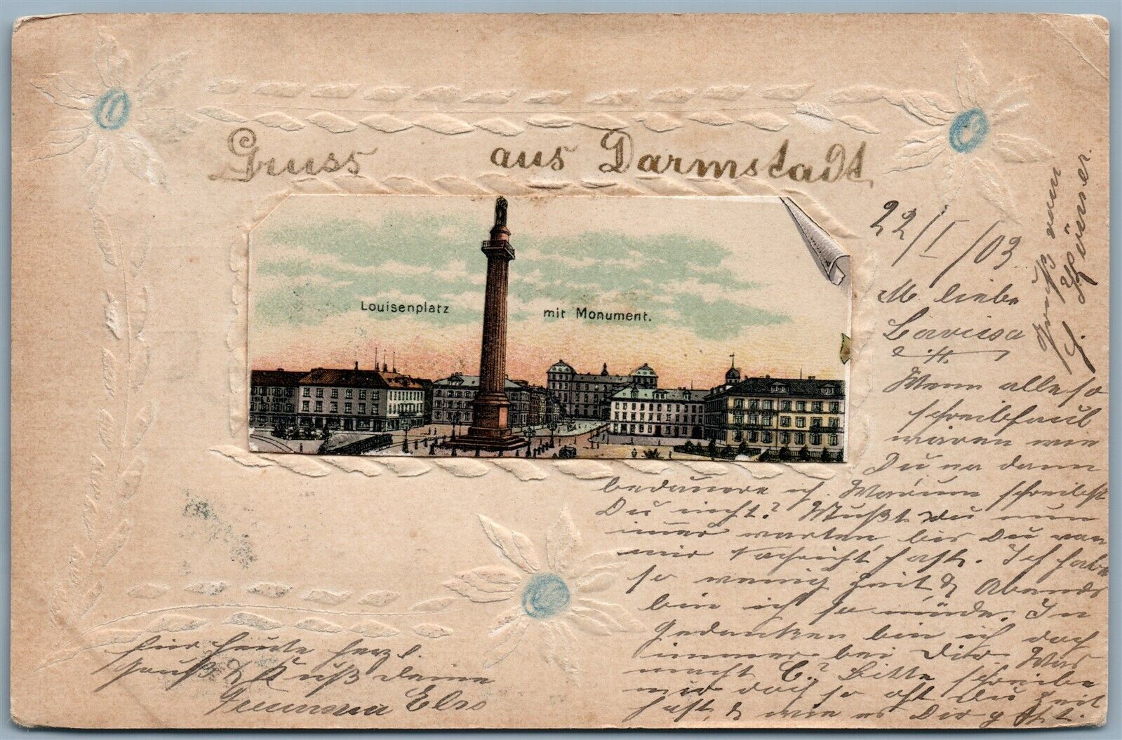 GRUSS AUS DARMSTADT GERMANY 1903 EMBOSSED UNDIVIDED ANTIQUE POSTCARD w/ STAMP