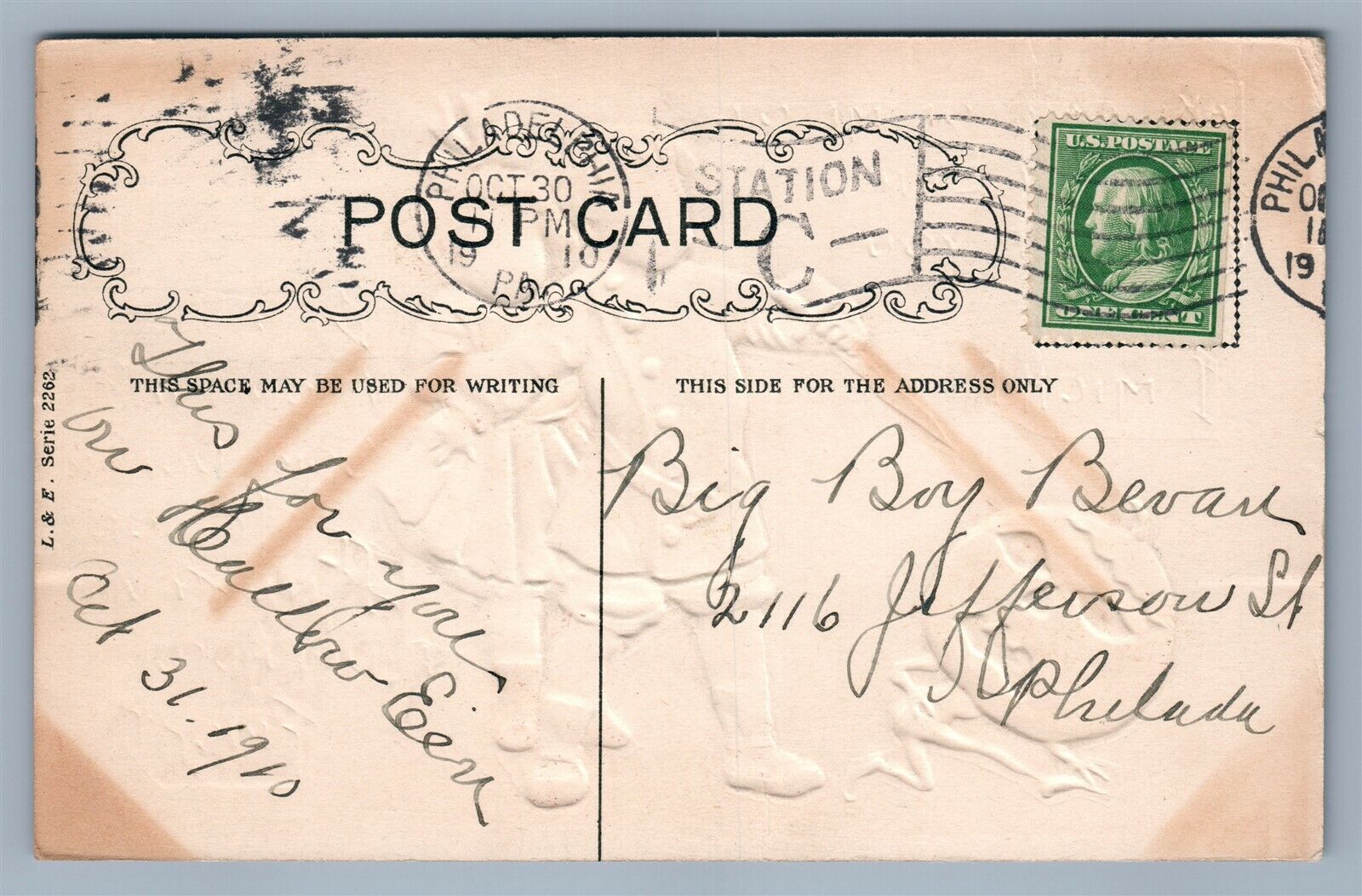 HALLOWEEN 1910 ANTIQUE EMBOSSED POSTCARD BOY w/ SWORD by Leubrie & Elkus