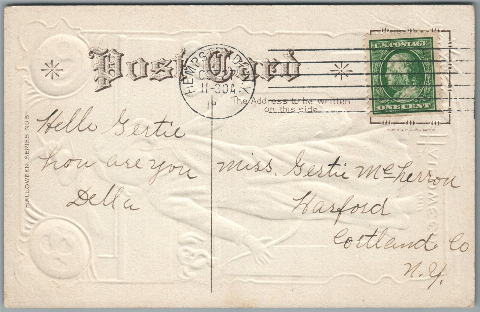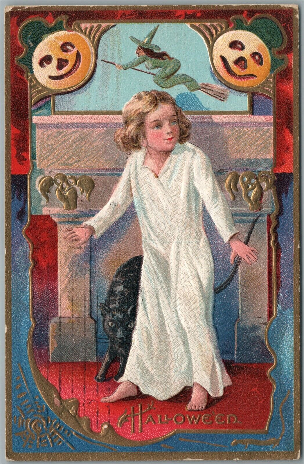 HALLOWEEN ANTIQUE POSTCARD KID w/ FLYING WITCH