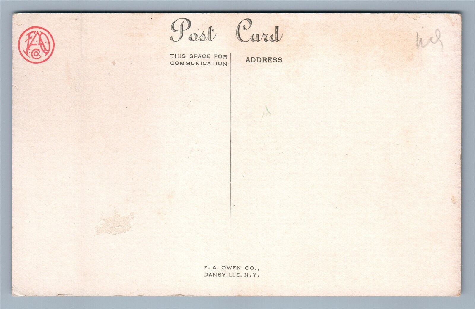 HALLOWEEN ANTIQUE POSTCARD printed in DANSVILLE NY PAIR of OWLS w/ CRESCENT MOON
