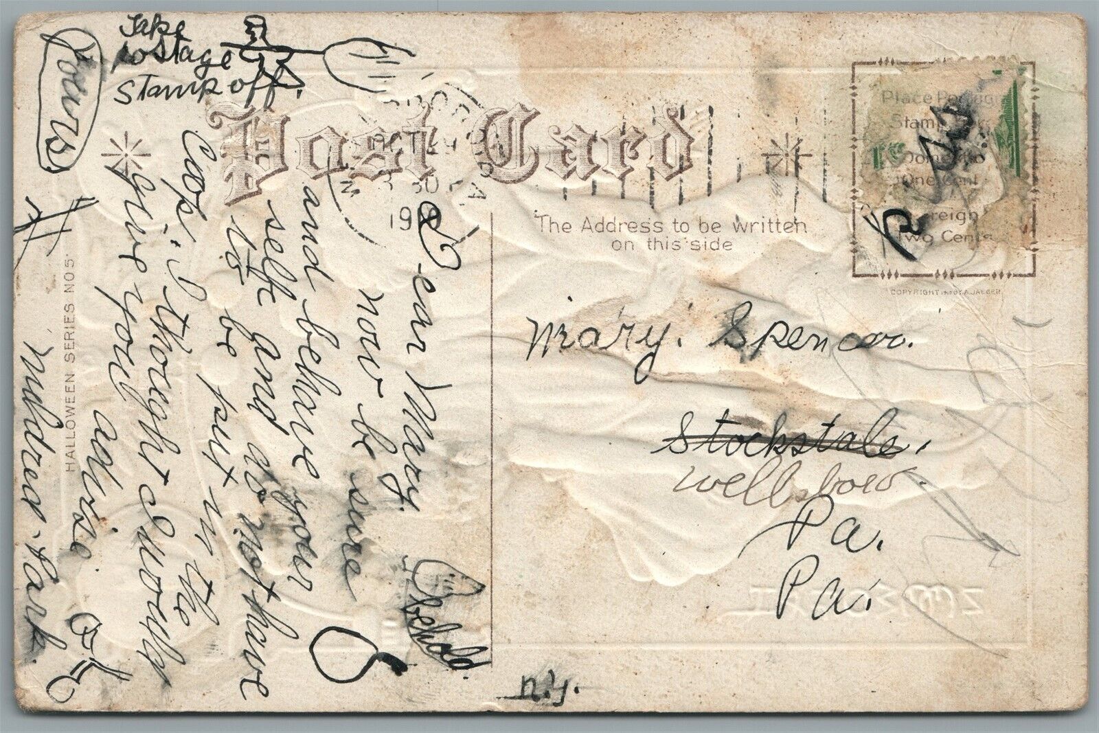 HALLOWEEN GREETINGS KIDS w/ BLACK CAT ANTIQUE EMBOSSED POSTCARD