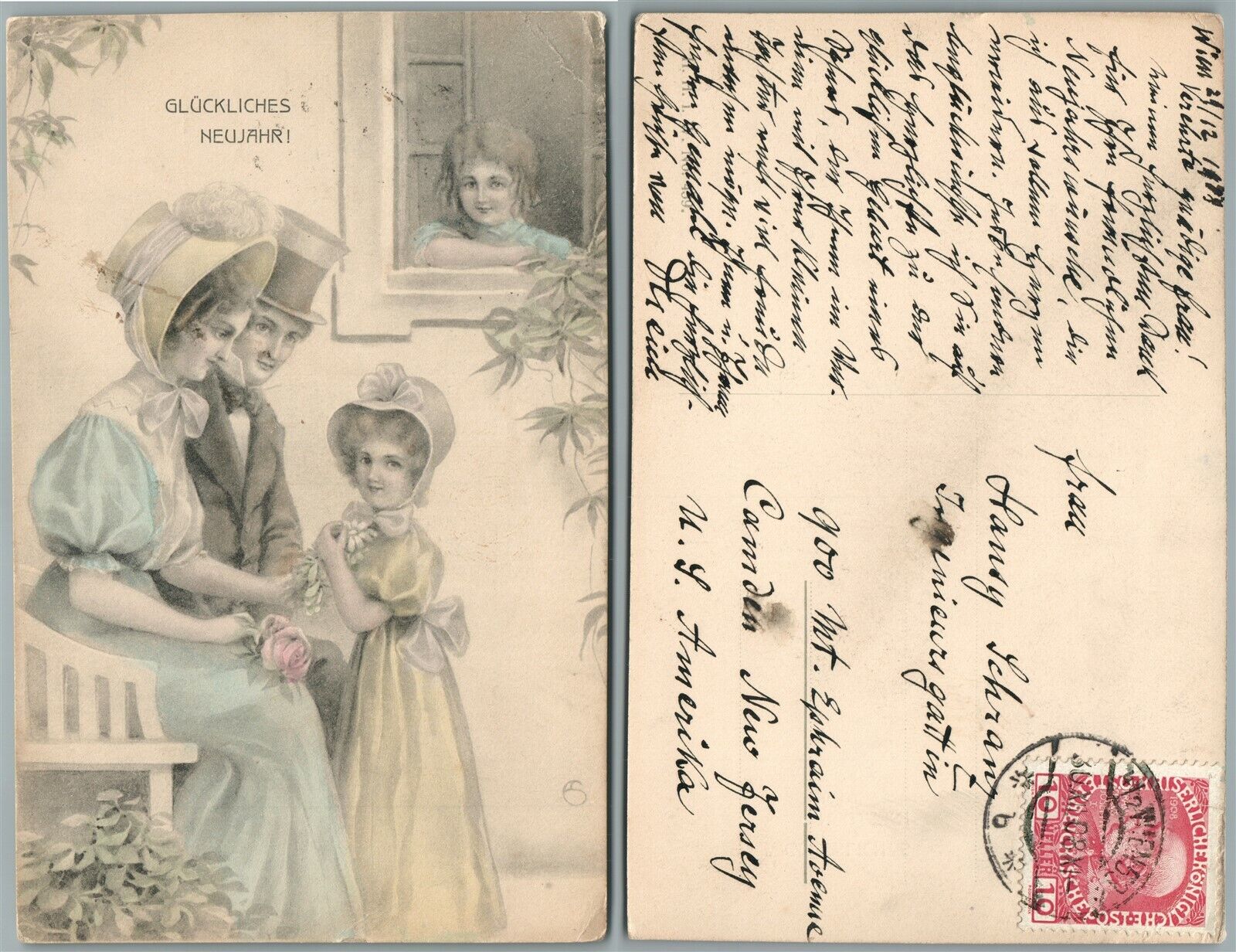 HAPPY NEW YEAR AUSTRIAN ANTIQUE ART POSTCARD of HAPPY FAMILY