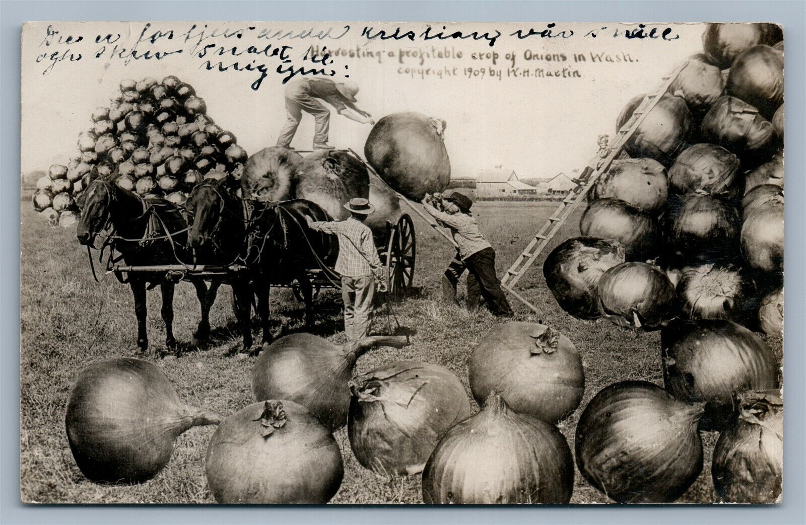 HARVESTING WASHINGTON ONIONS EXAGGERATED ANTIQUE REAL PHOTO POSTCARD RPPC
