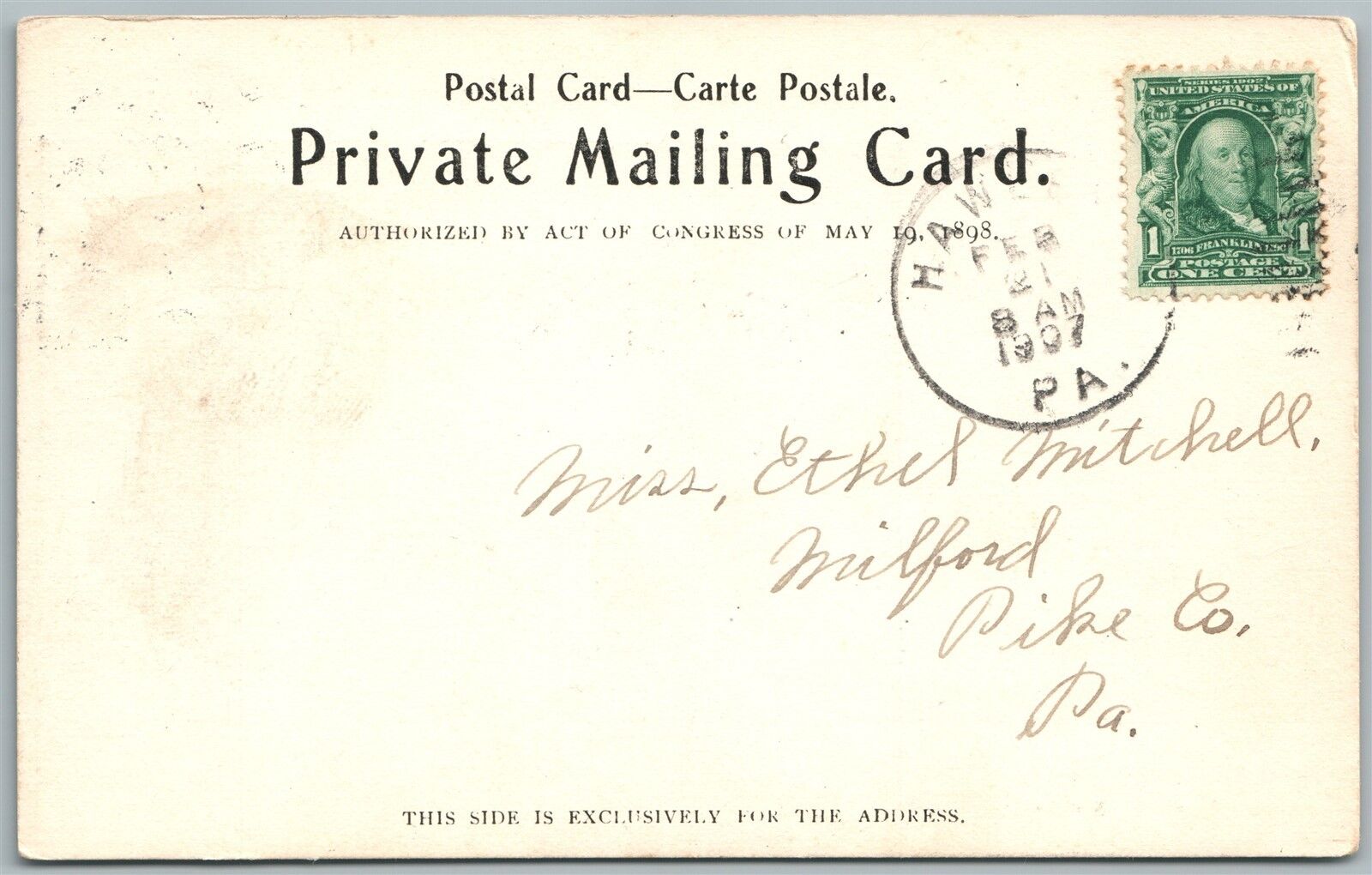 HAWLEY PA FIRST NATIONAL BANK 1907 ANTIQUE POSTCARD PRIVATE MAILING CARD