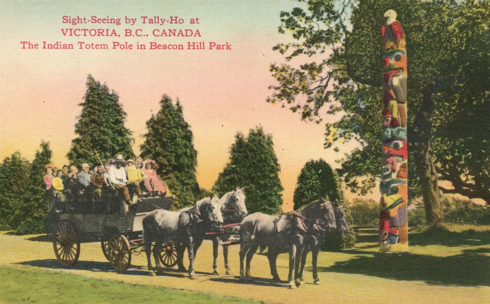 INDIAN TOTEM POLE BEACON HILL PARK CANADA TALLY-HO SIGHT-SEEING ANTIQUE POSTCARD